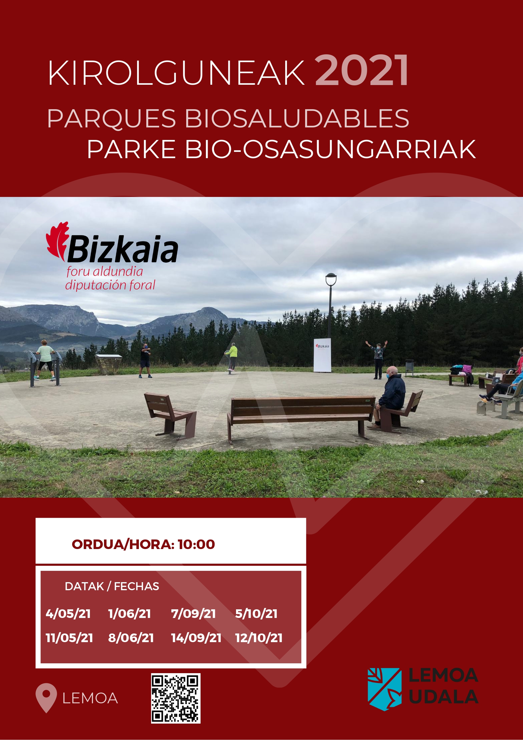 Parke Bio-Osasungarriak dinamizatzeko programan martxan da berriro Lemoan. Guztira 8 saio egingo dira, lau maiatza eta ekainean, eta beste lau irailean eta urrian. Astean ordu bateko saioak egingo dira, hiru helburu nagusirekin: