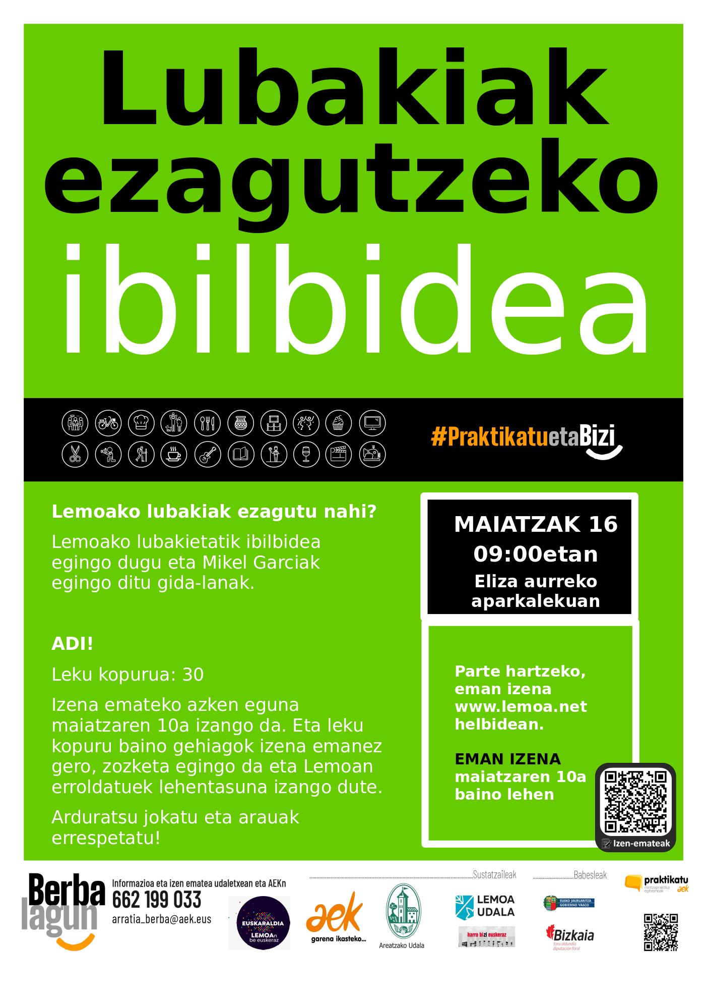 Lemoako lubakiak ezagutu nahi? Lemoako lubakietatik ibilbidea egingo dugu, eta Mikel Garciak egingo ditu gida-lanak. Leku kopurua mugatua da, eta izen-ematea egiteko azken eguna maiatzaren 10a izango da. Leku kopuru baino gehiagok izena emanez gero, zozketa egingo da eta Lemoan erroldatutakoek lehentasuna izango dute.
