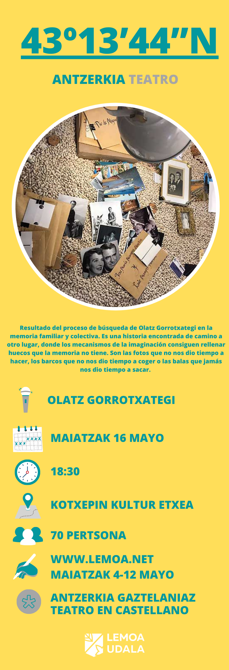 Lemoako Kultura eta Memoriaren astearen 18.edizioa ate joka daukagu. Maiatzaren 10ean hasi eta 16an bukatuko da aurtengoa, eta pandemiak guztiz baldintzatuta datorren arren, ez da hori berezitasun bakarra, Kotxepin Kultur Etxean burutuko den lehena ere bait da.