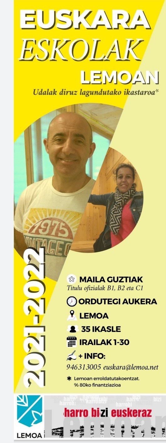 Informazio guztia: http://www.lemoa.net/eu-ES/Albisteak/Orriak/20210719-euskara-eskolak-lemoan.aspx