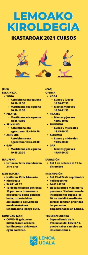 Informazio guztia: http://www.lemoa.net/eu-ES/Albisteak/Orriak/20210902-oferta-cursos-polideportivo-2021-2022.aspx