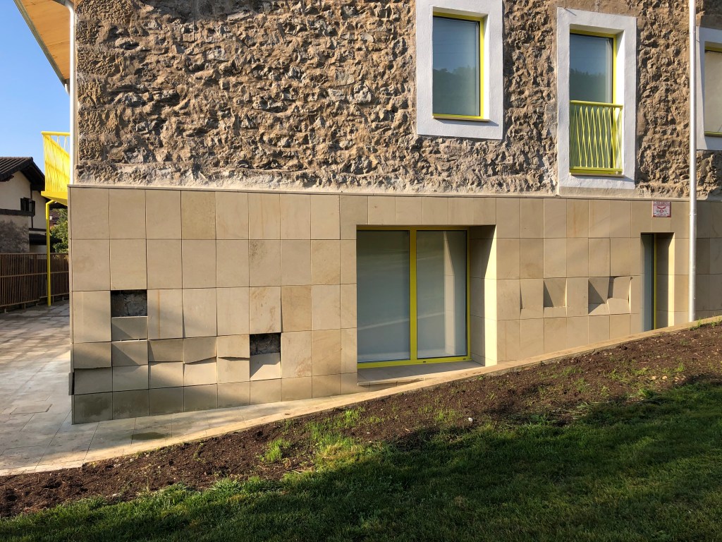 Fatxada aireztatua da, hareharri naturalez egina. Fatxada honekin aire kamara bat sortzen dugu kanpoko eta barruko azalaren artean, estankoa ez dena, espazio hori aireztatzea ahalbidetzen duena. Fatxada-sistema horrek kondentsazioak saihesten ditu eta plakatzearen junturen artean sar daitezkeen ur-iragazketak ezabatzen ditu. Fatxada iraunkorra da, estaldura-sistemarik onenetakoa, bai eraikuntza berrian, bai birgaitzeetan, eta ez du ia mantenurik behar.