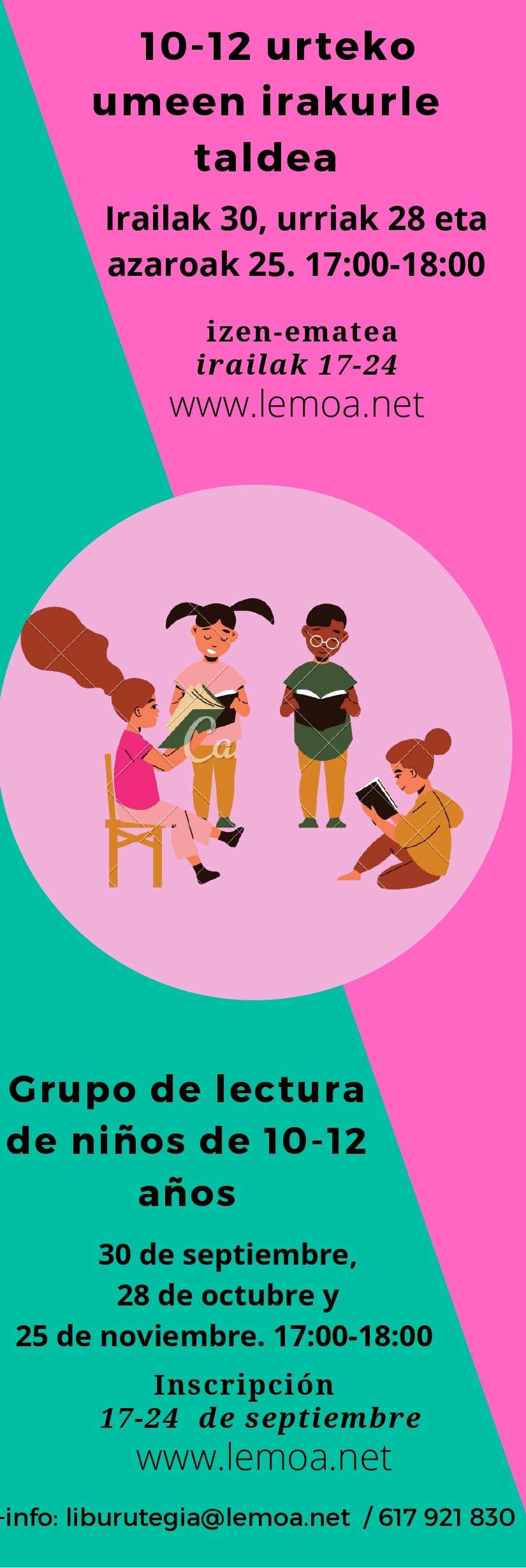 A través de este grupo de lectura, además de fomentar la lectura de las y los niños, queremos reflexionar sobre diversos temas que les serán muy cercanos en su vida cotidiana. A partir de cada uno de los libros que vamos a leer, hablaremos del tema principal que se plantea en el libro, de los personajes, de las situaciones concretas del libro… aportando cada uno desde su punto de vista y consiguiendo una lectura más rica a través de la interacción entre todos.