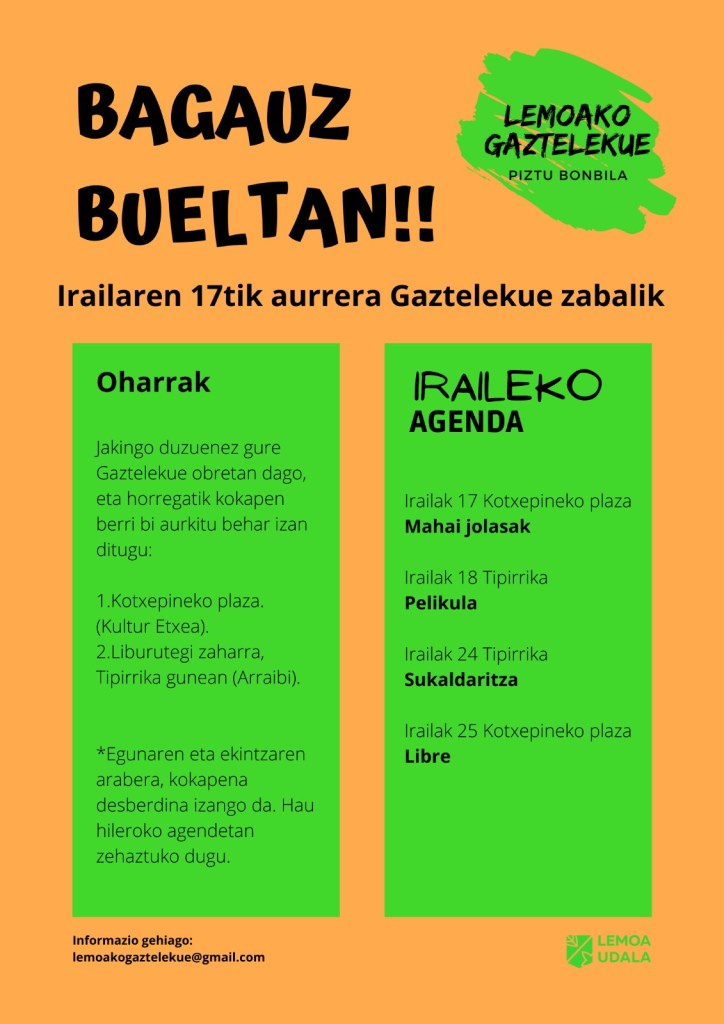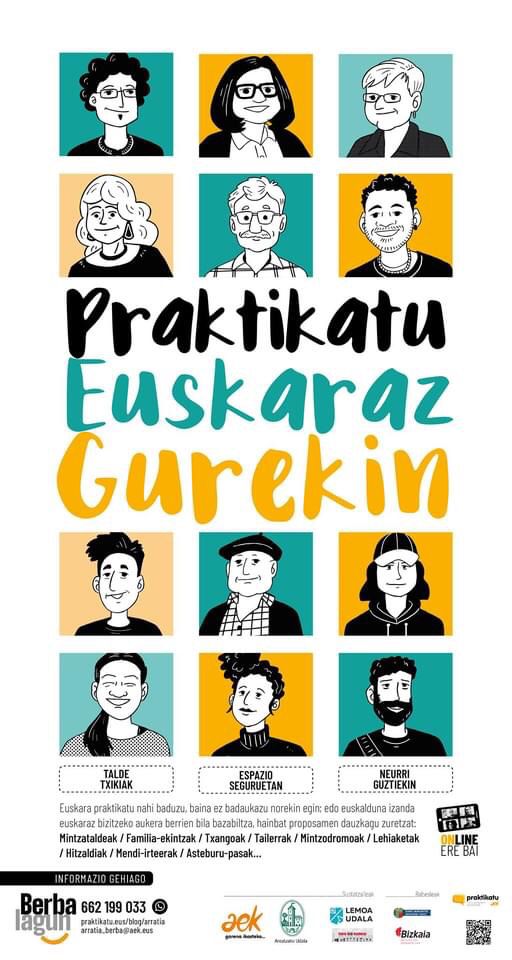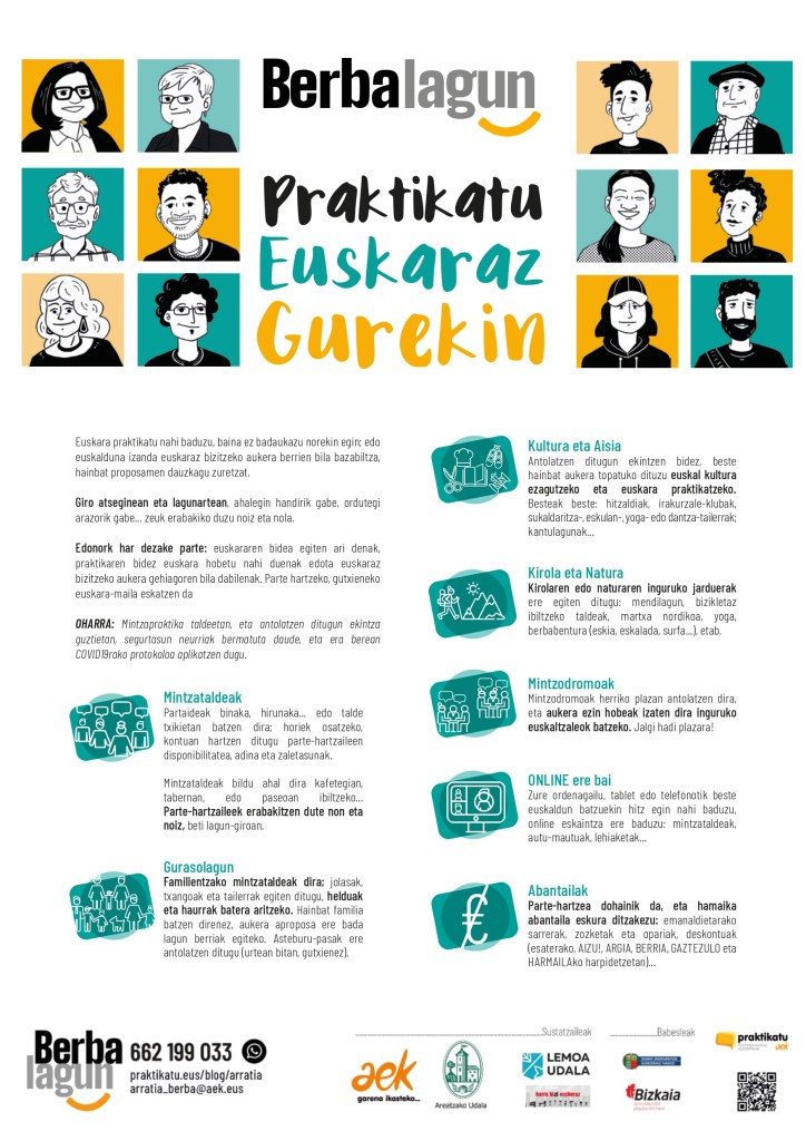 Información para participar en la iniciativa berbalagun en el teléfono 662 199 033, en arratia.berba@aek.eus o en praktikatu.eus/blog/arratia. Si quieres hablar en euskera y no tienes con quién practicar, apúntate.