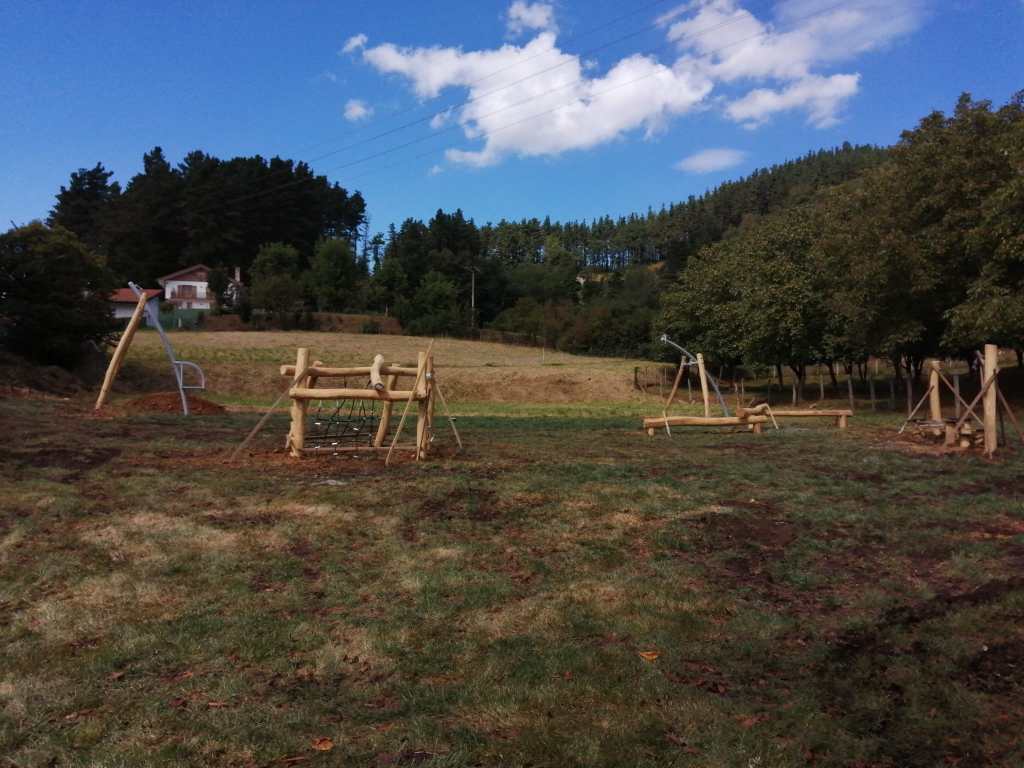 El jardín de la Casa de Cultura Kotxepin empieza a coger forma. Esta semana se ha estado realizando la obra de la zona de juegos, que ya está abierta. Las características de esta zona de juego son: parque de actividades de robinia maderera, zonas de equilibrio, para subir, descansar y hacer tirolina.