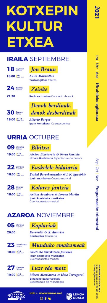 Gaurtik aurrera, urriko eta azaroko programazioari dagozkion sarrerak eskuragarri daude, eta bai kreditu-txartelarekin zein Bizum bidez ordaindu ahal izango da. Norbaitek sarrerak erosteko laguntza behar badu, Kotxepin Kultur Etxera joan ahal izango da astelehenetik ostiralera, 10:30etik 12:30era.