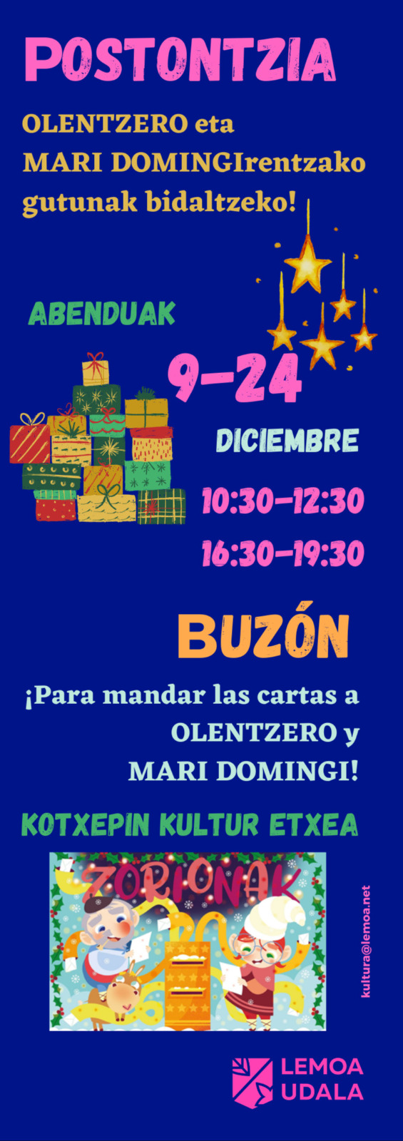 EUS Olentzero eta Mari Domingi oso lanpetuta ibiliko dira datozen asteetan, eta opariak etxe guztietara heldu daitezen antolakuntza on bat behar-beharrezkoa da. Horregatik, Lemoako umeen kasuan Kotxepin Kultur Etxean utzi beharko dituzte gutunak, abenduaren 9tik 24ra, 10:30etatik 12:30etara, eta 16:30etatik 19:30etara.