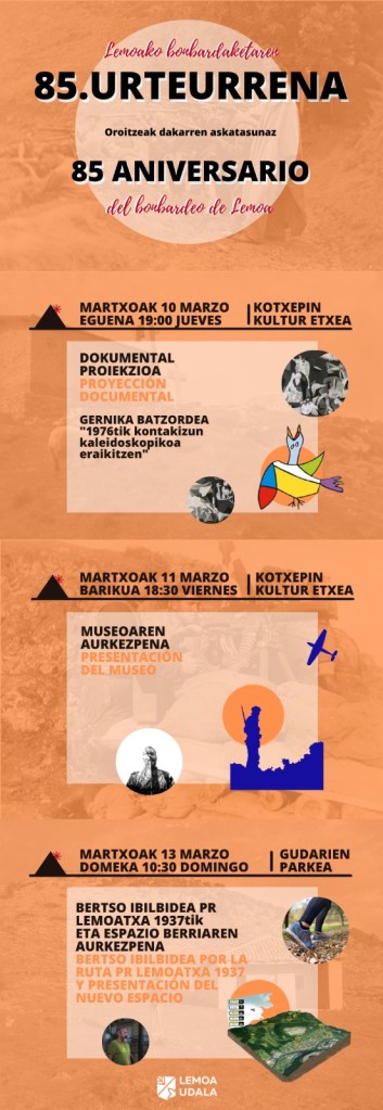 Desde entonces, se ha recorrido un interesante camino y este año, aprovechando que se cumple el 85 aniversario del bombardeo de Lemoa, el Ayuntamiento de Lemoa ha preparado un interesante programa bajo el título de “La libertad que trae consigo la memoria”.