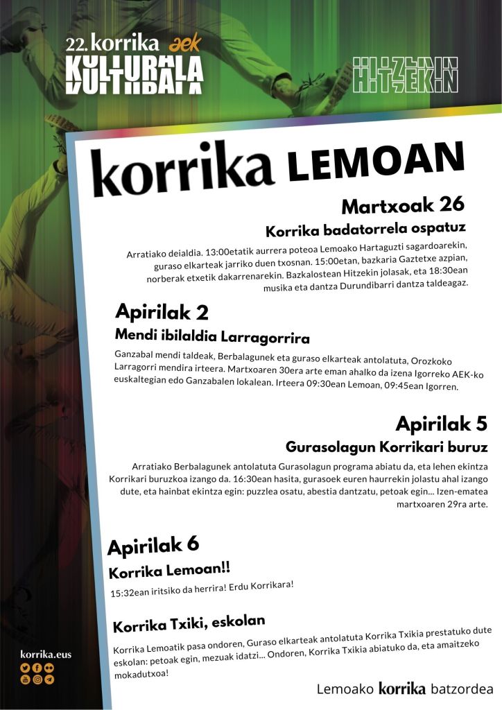 No obstante, en los próximos días se llevarán a cabo varias actividades relacionadas con la Korrika: mañana, 2 de abril, organizado por el grupo de montaña Gantzabal, Berbalagun y la Asociación de familias, se realizará una salida al monte Larragorri de Orozko. El martes, 5 de abril, la iniciativa Gurasolagun realizará juegos sobre la Korrika; los niños y niñas jugarán con sus padres y madres. El miércoles 6 de abril, tras el paso de la Korrika por Lemoa, se celebrará la Korrika Txiki en la escuela, organizada por la asociación de familias y la Ludoteka.