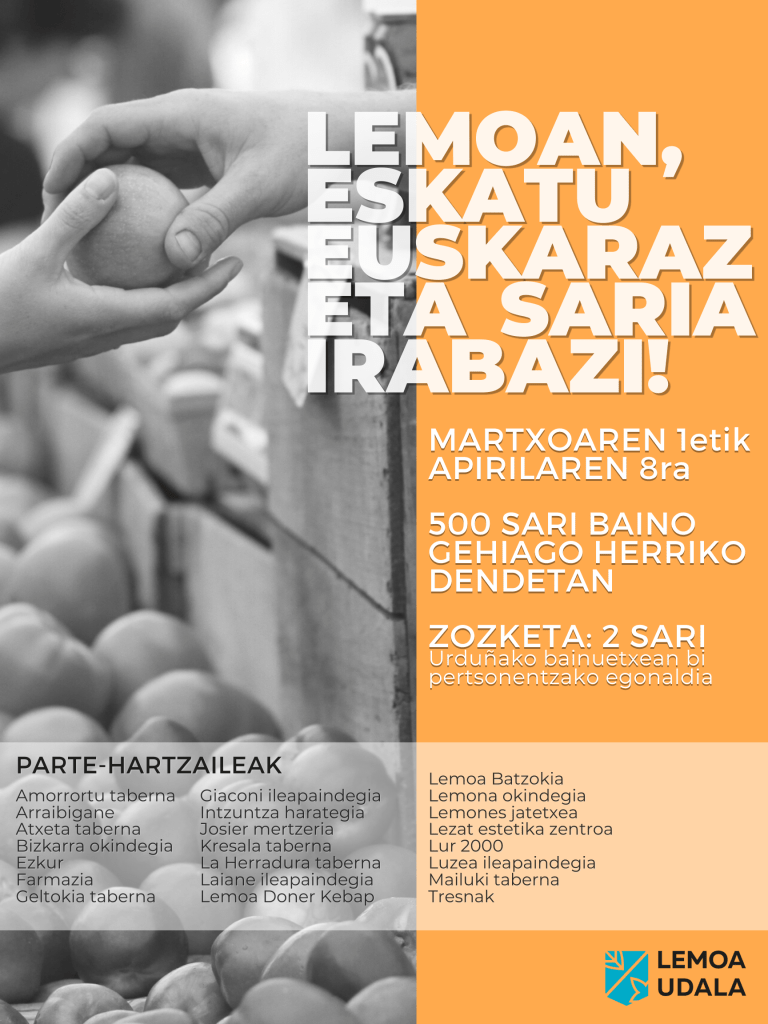 [EUS] Lemoako Udaleko Euskara zerbitzuak martxo hasieran abian jarri zuen merkataritza kanpaina. Parte hartu zuten herriko 22 establezimenduk, eta euskaraz eskatzen zutenei txartel bat ematen zien saltzaileak; bertan, herriko beste establezimendu batek jarritako sari bat jaso zitekeen, edo saririk gabeko boletoekin zozketa batean parte hartu daiteke. Era horretan, euskara eta Lemoako merkataritza sustatu gura izan da.