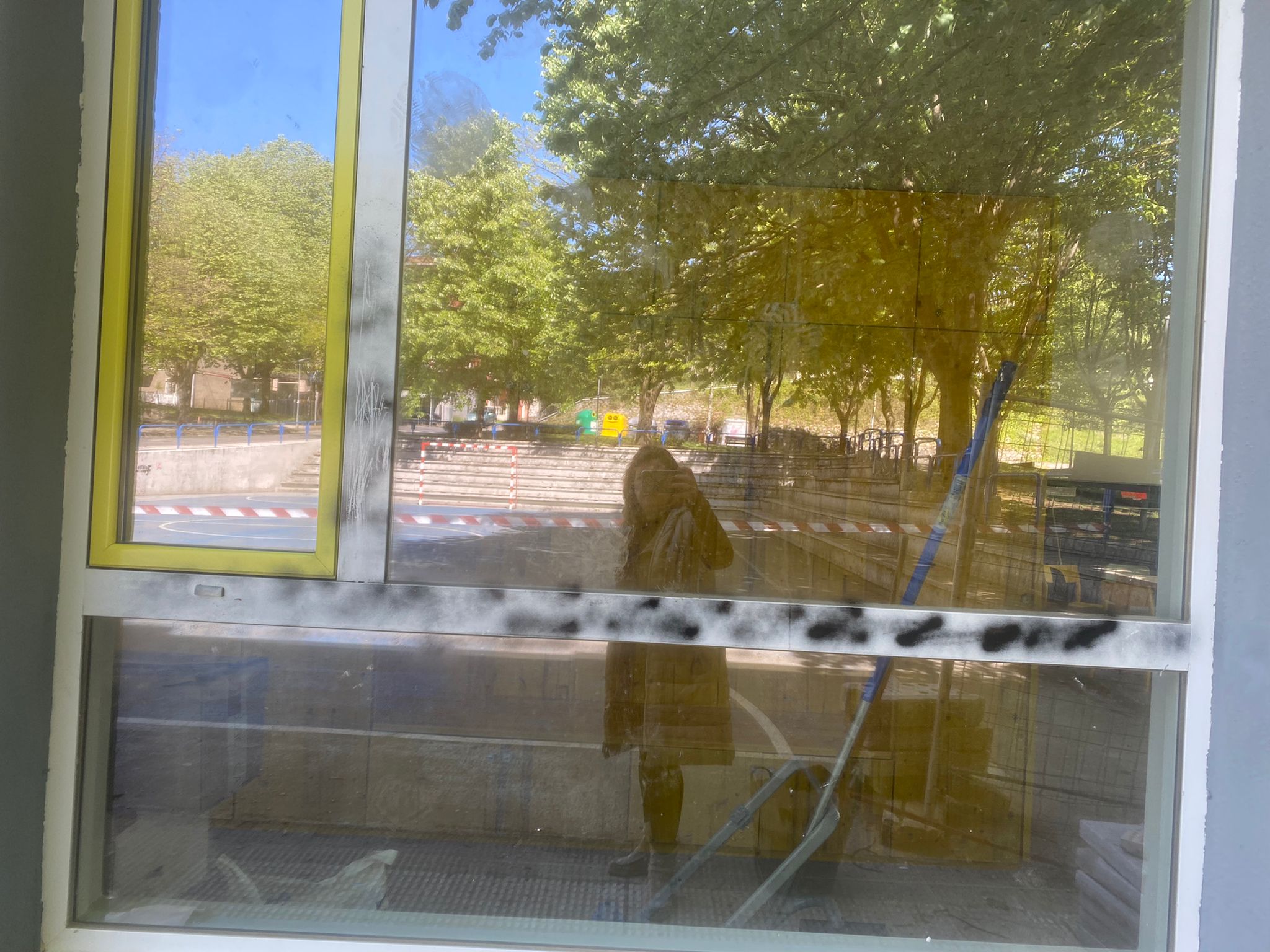 Kulturguneko leiho bat espraiz zikinduta agertu da – Una ventana de Kulturgunea aparece manchada con spray