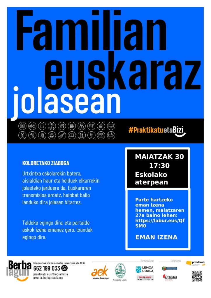 [CAS] La iniciativa Berbalagun ha organizado una actividad para familias junto a Urtxintxa. Aunque inicialmente estaban previstas para llevarse a cabo el diez de mayo, se ha pospuesto al treinta. El objetivo será incidir en la transmisión del euskera, y para ello pondrán a niñ@s y personas adultas a jugar junt@s. Para participar inscríbete antes del 27 de mayo en el siguiente enlace: