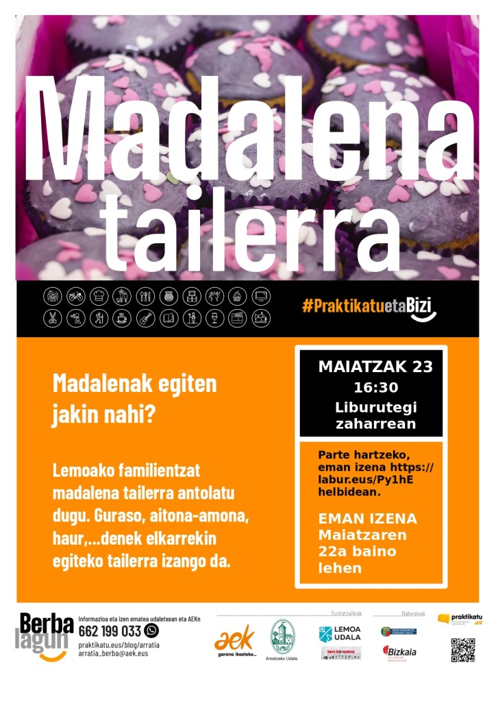 Ludoteka gaineko liburutegi zaharrean izango da tailerra, eta 16:30ean hasiko da maiatzaren 23an. Bertan, familiek, gurasoek zein aitita-amamek madalenak egingo dituzte haurrekin batera, eta zelan ez dastatu ere bai.