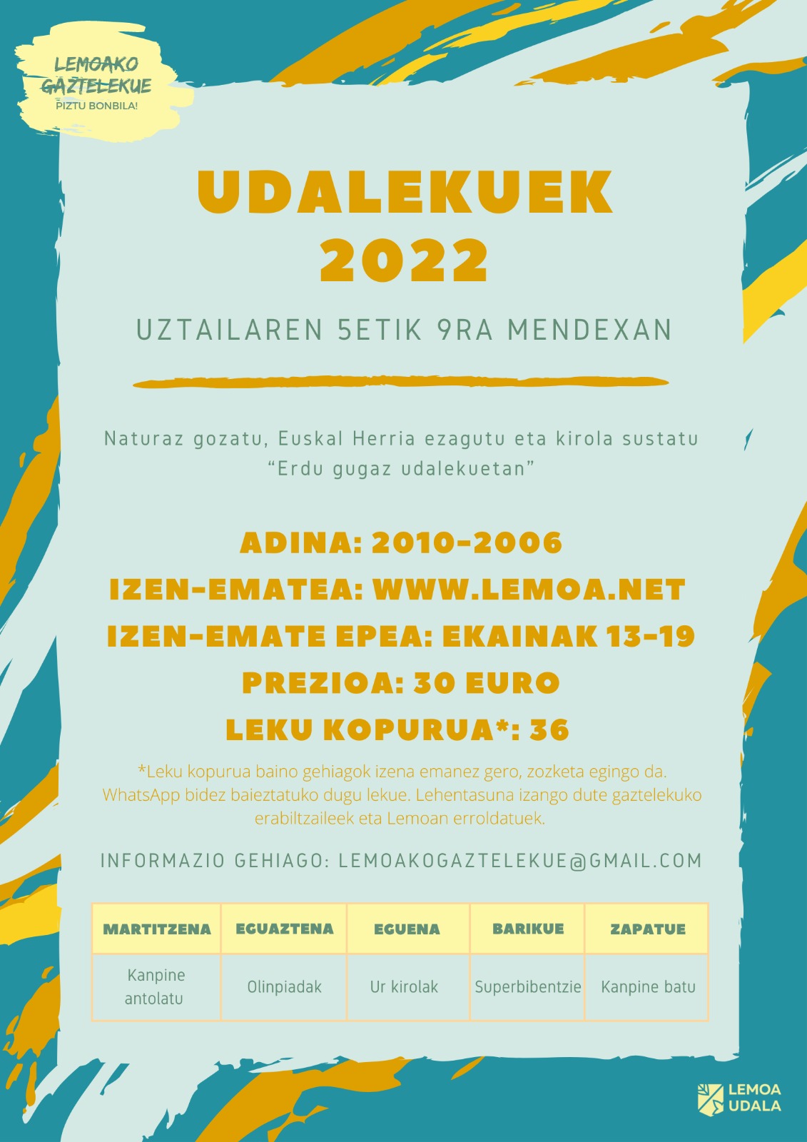 [eus] Izen-ematea arrakastatsua izan da, eta talde denak antolatu ondoren, haur eta gazte guztiei lekua egin zaie. Horrela, izena eman duten guztiek herri udaleku eta ludoteka ibiltarian parte hartu ahal izango dute.