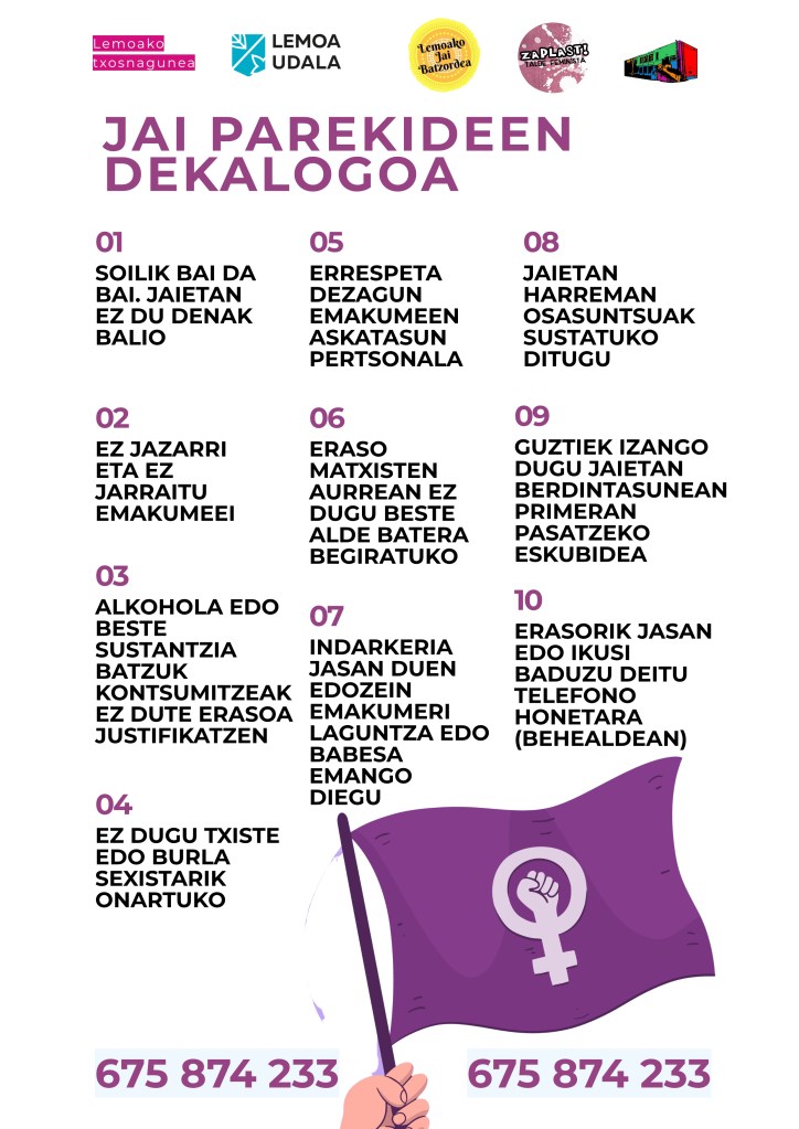 [cas] El Ayuntamiento de Lemoa, junto a la Comisión de Fiestas, Txosnagunea, el grupo feminista Zaplast y el Gaztetxe han llevado a cabo este decálogo de fiestas igualitarias.