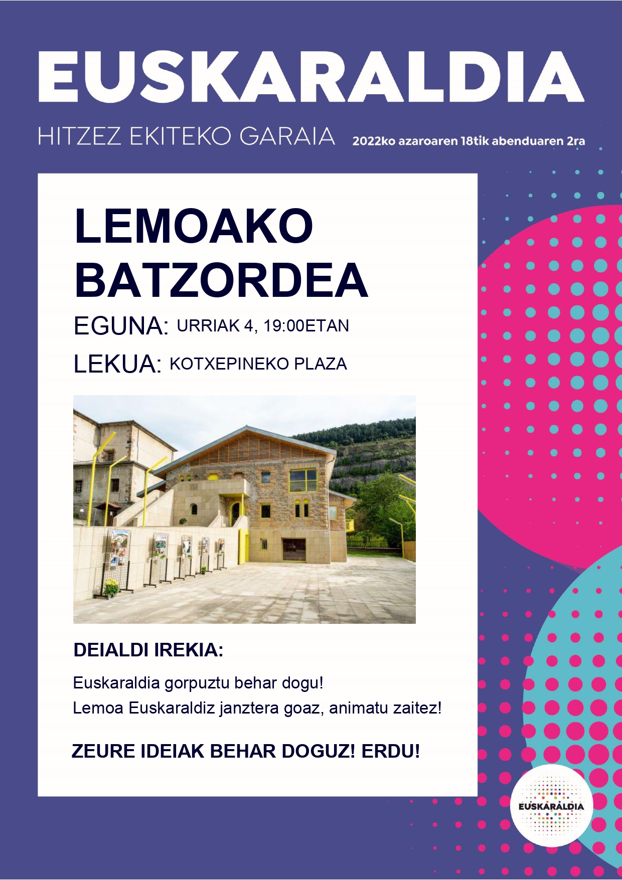[cas] El próximo 4 de octubre a las 19:00 horas está prevista la activación de la comisión de Lemoa en la Plaza de Kotxepin.