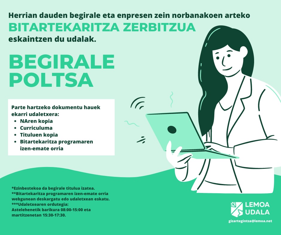 Para apuntarte envía un mensaje de INSCRIPCIÓN o Whatsapp (arratia_berbalagun@aek.eus o llamar al 662 19 90 33), pasa por el Ayuntamiento de Lemoa o pincha en este enlace http://emanizena.praktika /