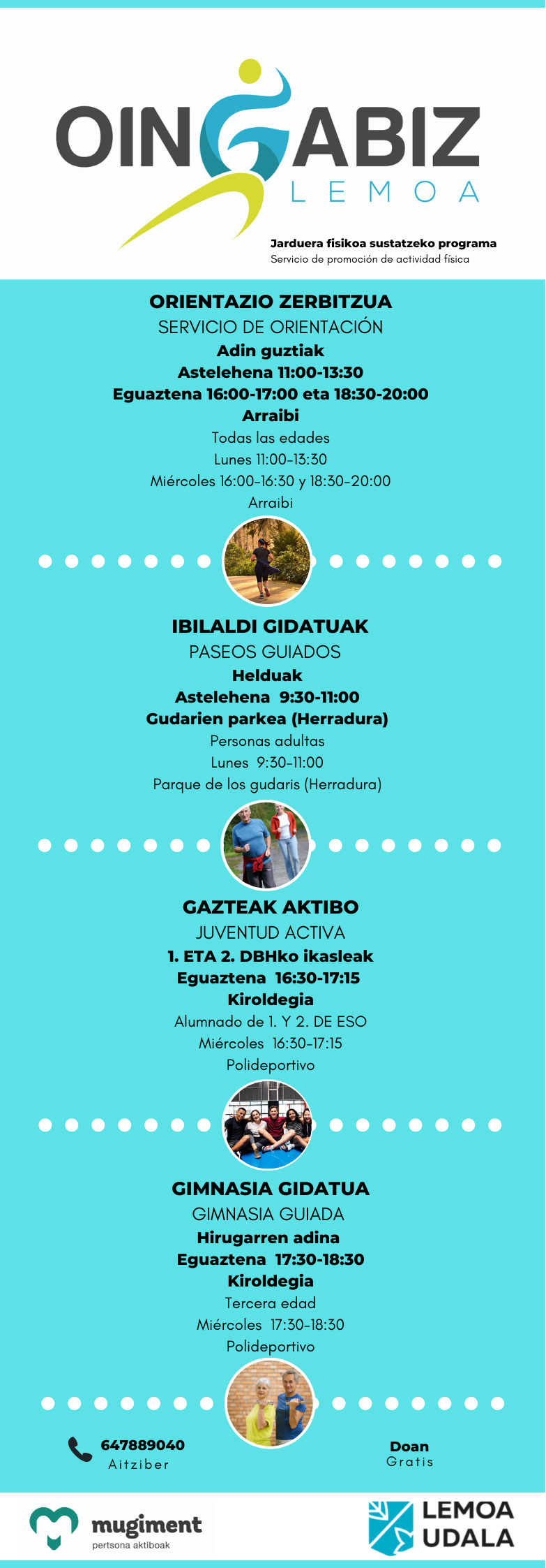Oingabiz, ariketa fisikoa eta osasuna sustatzeko doako zerbitzua martxan jarri da udako oporren ostean, eta hauek dira eskaintzen dituen zerbitzuak:
