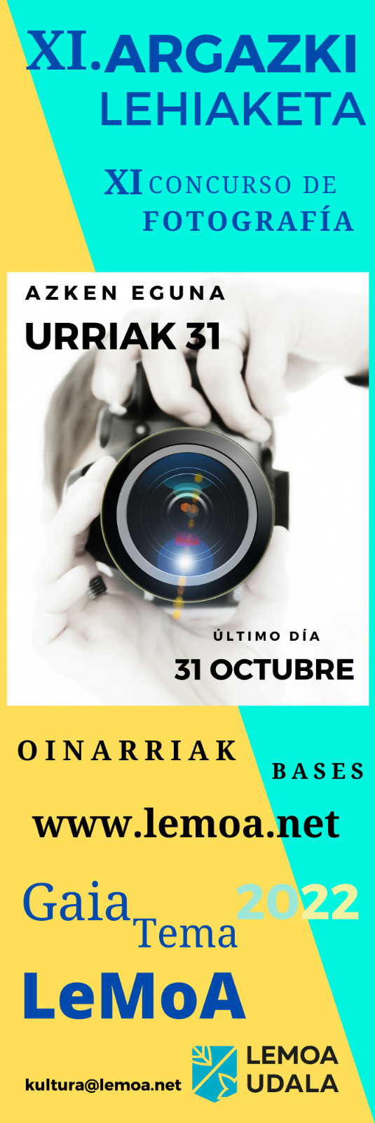 [eus] Urtero lez, udagoiena Lemoara iristen da bere argazki lehiaketaren eskutik. Edizio honetan, aurrekoetan bezala, udalerriko hamabi argazki onenak bilatzen ditugu: egutegiko hilabete bakoitzeko bat. Gaia udalerria bera da, iradokitzen eta motibatzen gaituena, gure kamerarekin islatu gura duguna. Argazkia aurkezteko azken eguna (parte-hartzaile bakoitzeko bat) urriaren 31 da.