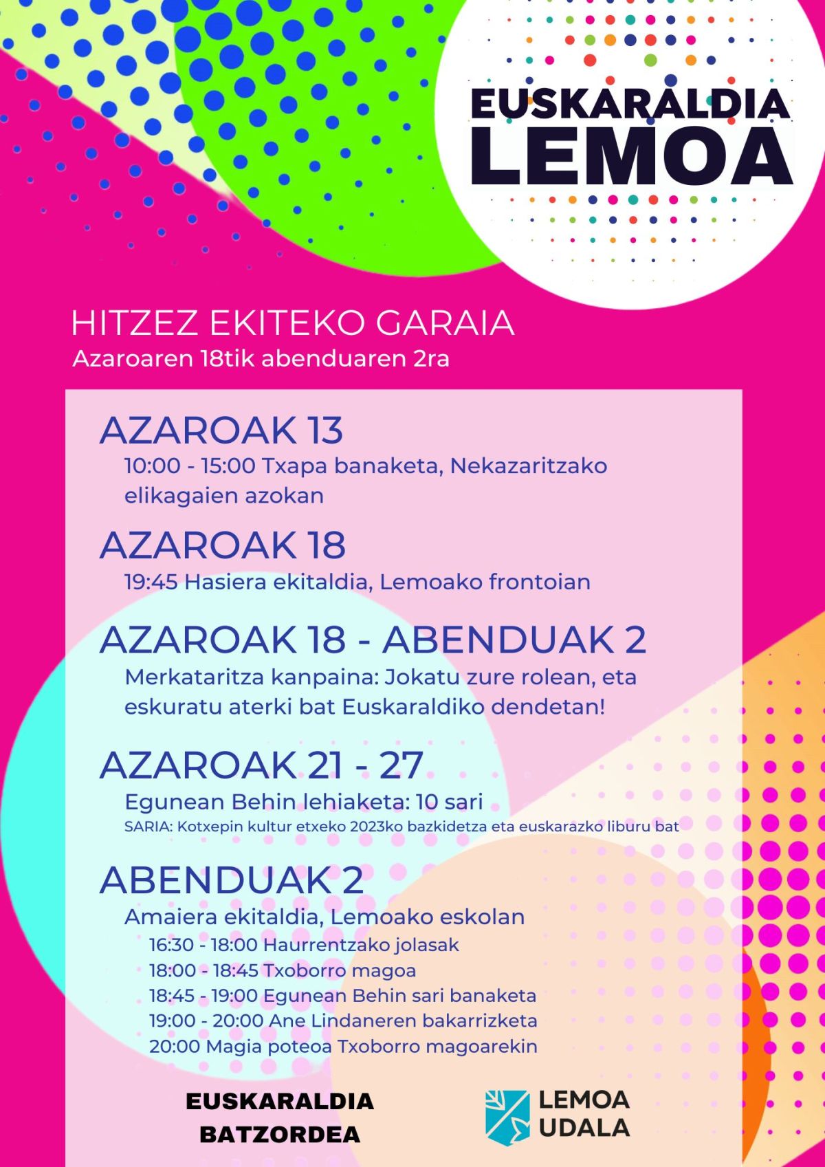 Hoy mismo se celebrará el acto inaugural en el frontón, en el descanso de los segundos y terceros partidos de la exhibición de pelota. Se realizará un colocación simbólica de chapa, y el acto estará amenizado por el músico lemoaztarra Fran Urías. Además, se instalará una mesa de reparto de chapas y venta de banderolas.