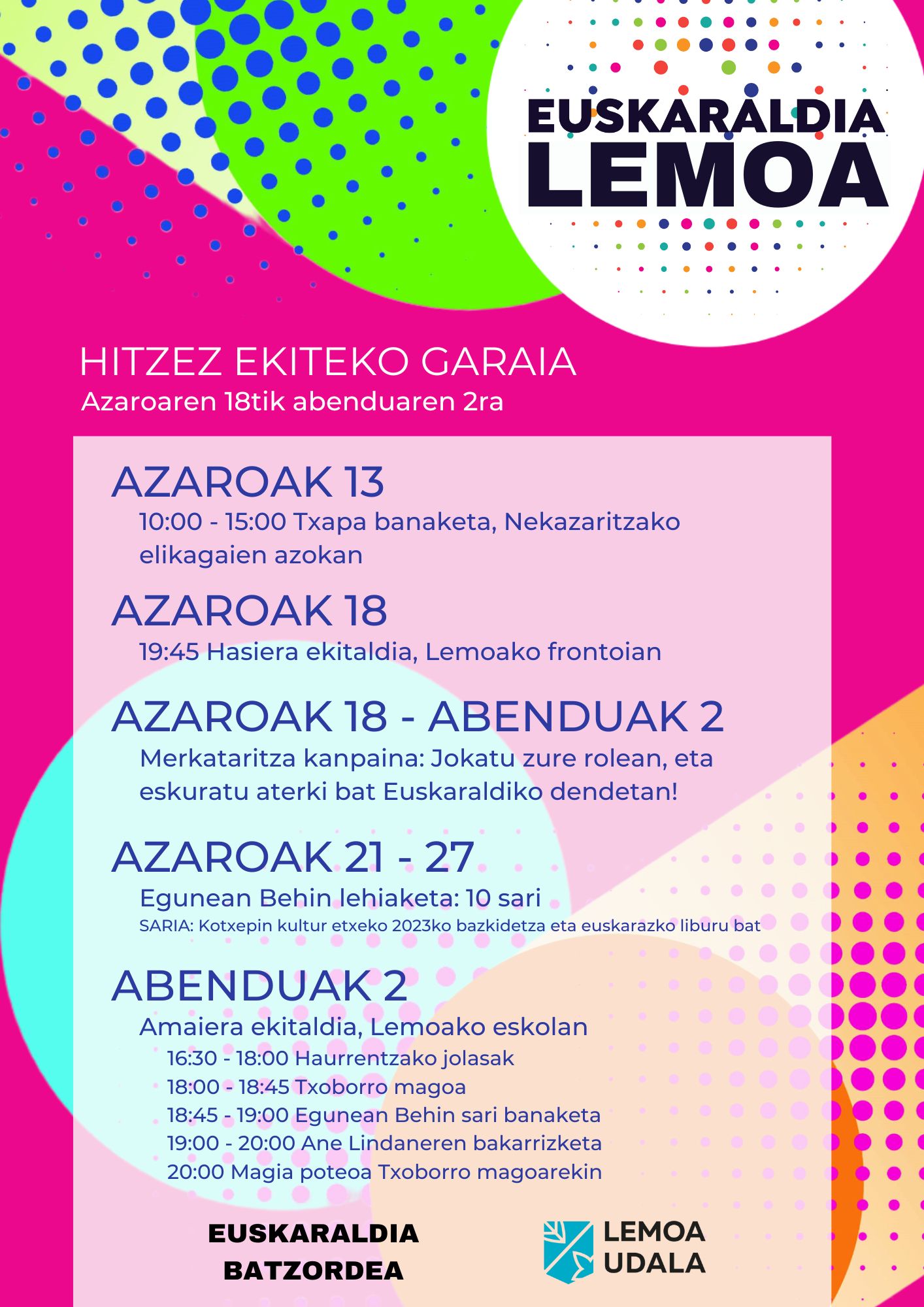 [eus] Aurreko urteetako datuen antzera, Lemoan 310 pertsona baino gehiagok eman du izena Euskaraldian. Hizkuntza ohiturak aldatzeko prest daude Ahobiziak eta Belarriprestak. Jantzi txapa eta atera kalera euskaraz ekitera! Gaur bertan hasiera ekitaldia egingo da frontoian, pilota erakustaldiaren bigarren eta hirugarren partiden atsedenaldian. Txapa jartzeko ariketa egingo da, eta Fran Urias musikari lemoartuak girotuko du … Irakurtzen jarraitu Hasi da Euskaraldia! 310 pertsona baino gehiagok hartuko dute parte Lemoan! ¡Empieza Euskaraldia! ¡Más de 310 personas participarán en Lemoa!
