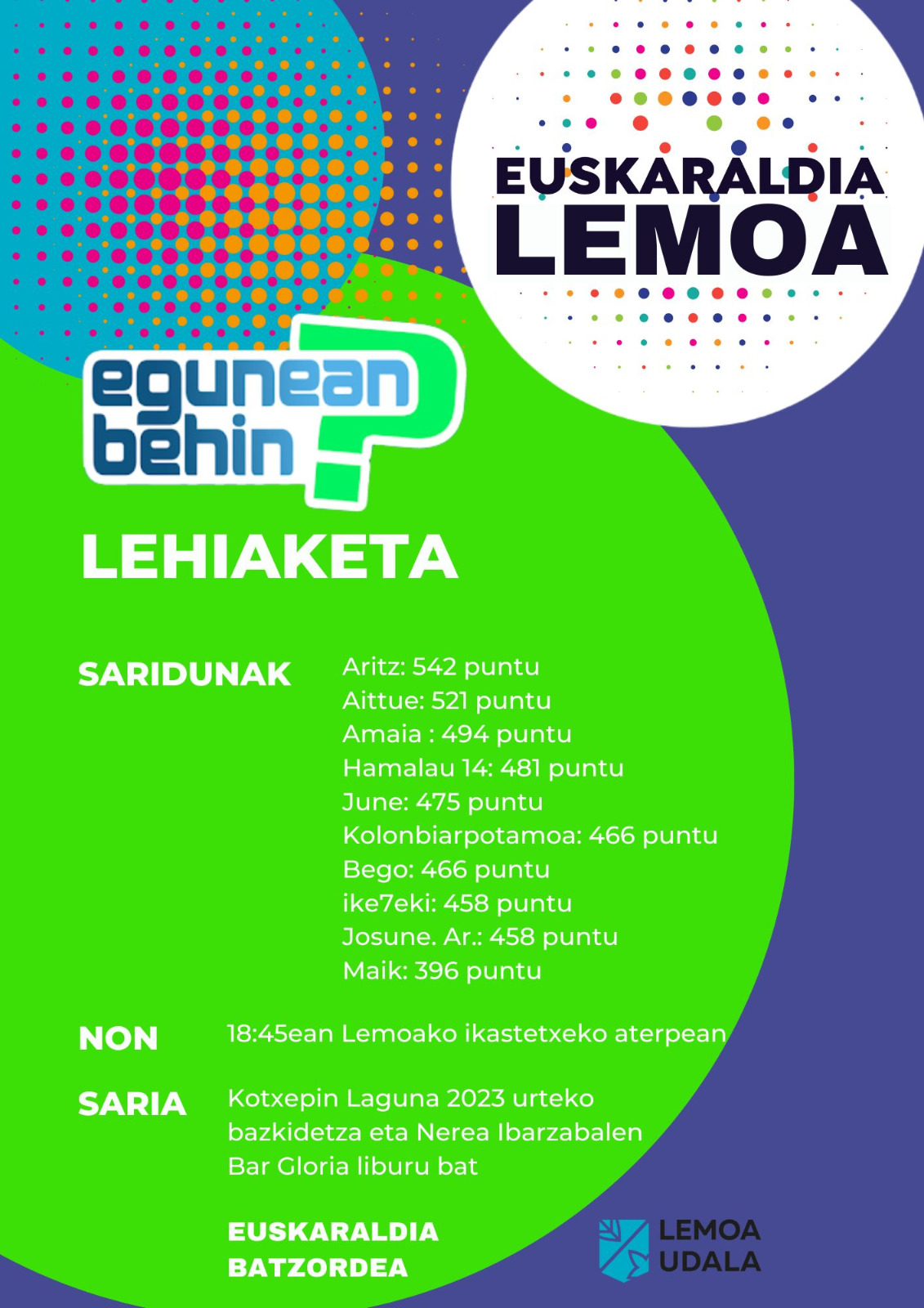 [eus] Egunean Behin jokoaren pasa den asteko partidek sariak izan zituzten, eta bariku honetan Euskaraldiaren amaierako ekitaldian banatuko ditugu, 18:45ean ikastetxeko aterpean. Lehen bederatzi sailkatuek jasoko dute saria, eta beste batek zozketa bidez. Erabiltzaile izena eta pasa den astean egindako puntuen arabera, hauek dira saridunak: Aritz: 542 puntuAittue: 521 puntuAmaia : 494 puntuHamalau 14: 481 … Irakurtzen jarraitu Egunean Behin jokoaren pasa den asteko partidek sariak izan zituzten!