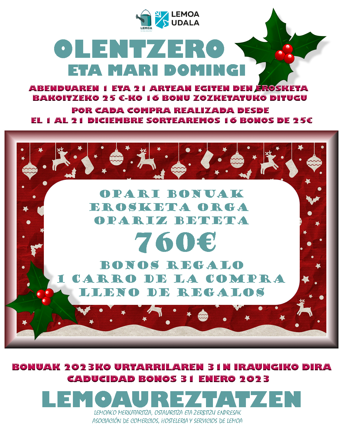 [eus] Abenduaren 1etik 21era artean egiten den erosketa bakoitzeko 25 euroko 16 bonu zozketatuko dira. – Erosketaren tiketa komertzioan bertan egongo den ureztaontzian sartu behar da. – Tiket horretan telefono zenbakia idatzita egon behar da. – Ureztaontzian komertzioan bertan gastatutako tiket bat baino gehiago sar daitezke. – Komertzio bakoitzak 25 euroko 2 bonu zozketatuko ditu … Irakurtzen jarraitu Olentzero eta Mari Domingi zozketak – Sorteos Olentzero y Mari Domingi