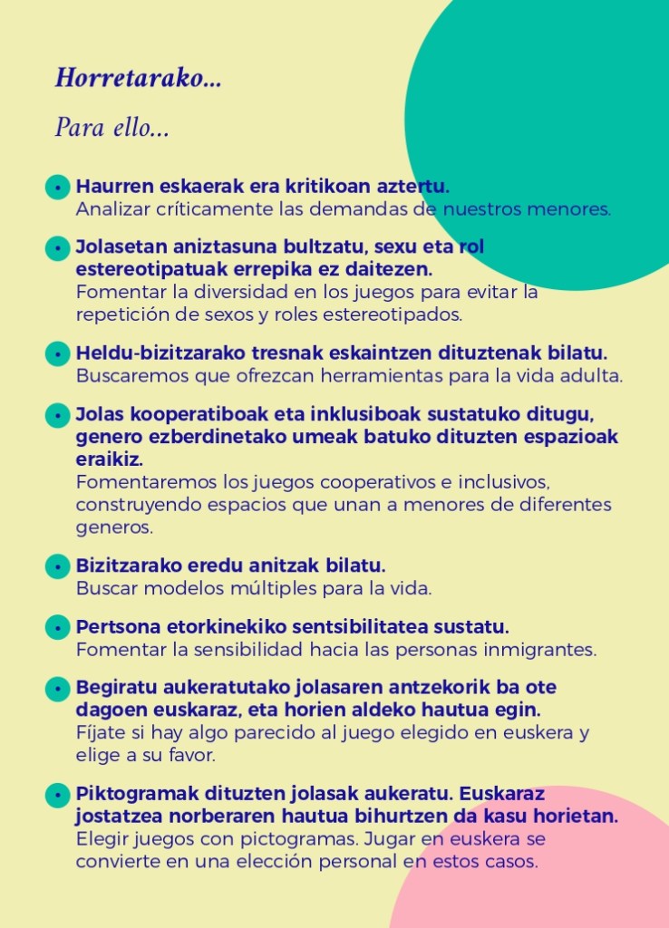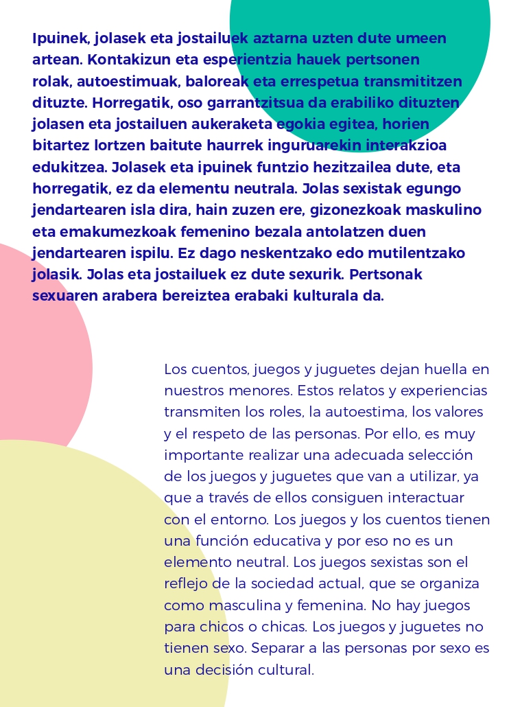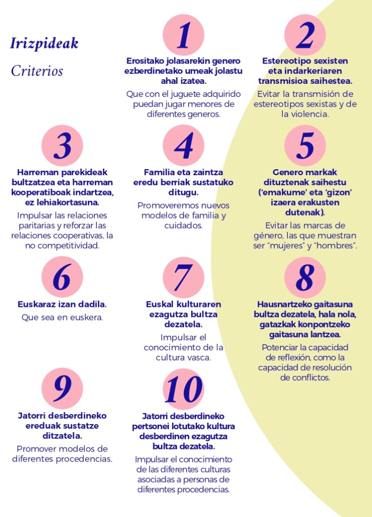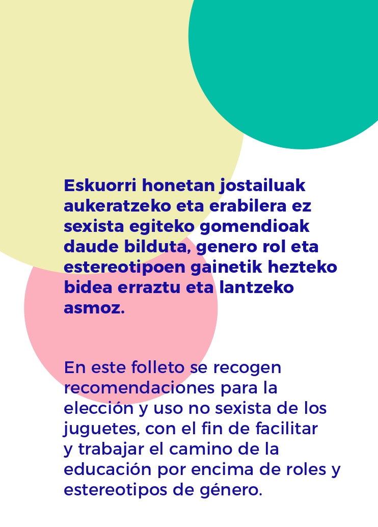 [eus] Sasoi honetan, Gabonak eta Durangoko azoka direla-medio, ipuin eta jostailu dezente erosi ohi ditugu. Arrazoi horregatik, eta familientzako lagungarri izango delakoan, Lemoako Udaleko Berdintasun, Gizartegintza eta Euskara sailak eskuartean duzuen informazioa luzatzen dizue. Lan honen helburua da helduoi laguntzea liburu, jolas eta jostailu sexistak identifikatzen.