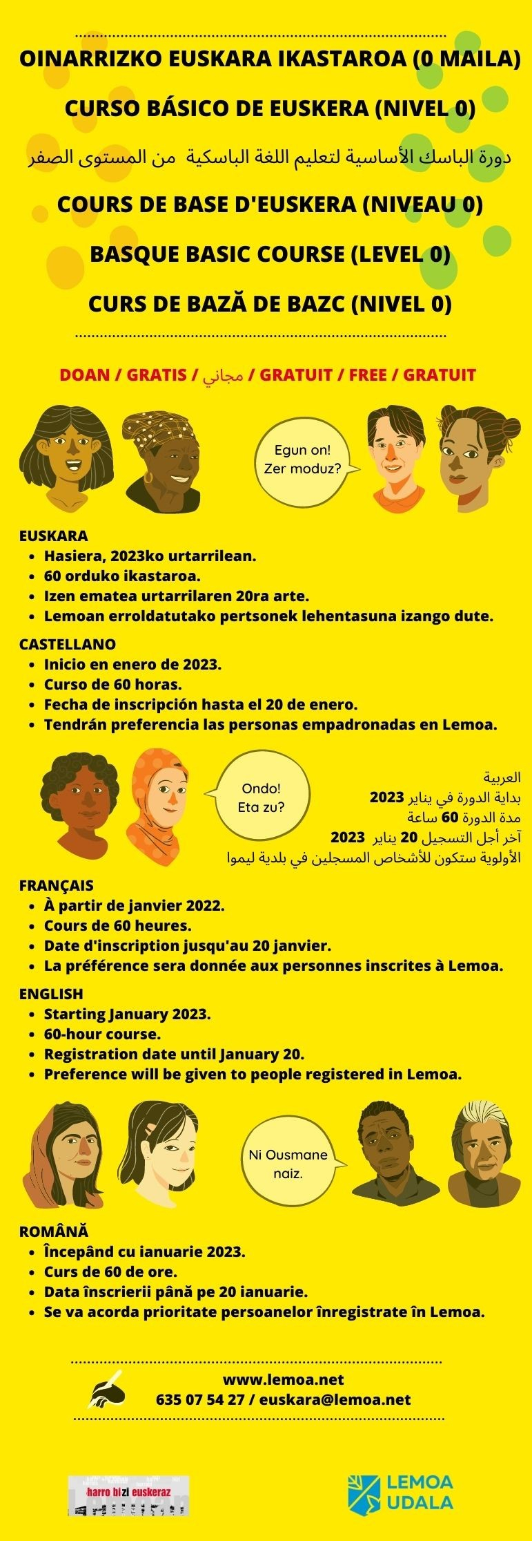 [eus] Lemoako Udaleko Euskara zerbitzuak etorkinentzako doako euskara ikastaroak antolatu ditu 2023 urterako. Lemoara iritsi diren pertsonek eman dezakete izena bertan, eta bakoitzaren beharrizanak zein diren aztertu ondoren, talde bat osatu nahi da. Ikastaro hauen helburua argia da: euskaltegietako A0 mailara iristeko euskarazko oinarrizko jakintza barneratzea. Izan ere, etorkinek askotan ez dauzkate halako errekurtsorik, eta euskaltegira joateko oinarrizko mailarik ere ez dute. Ikasle hauek hurrengo urratsak egin ditzatela izango da udalaren helburua.