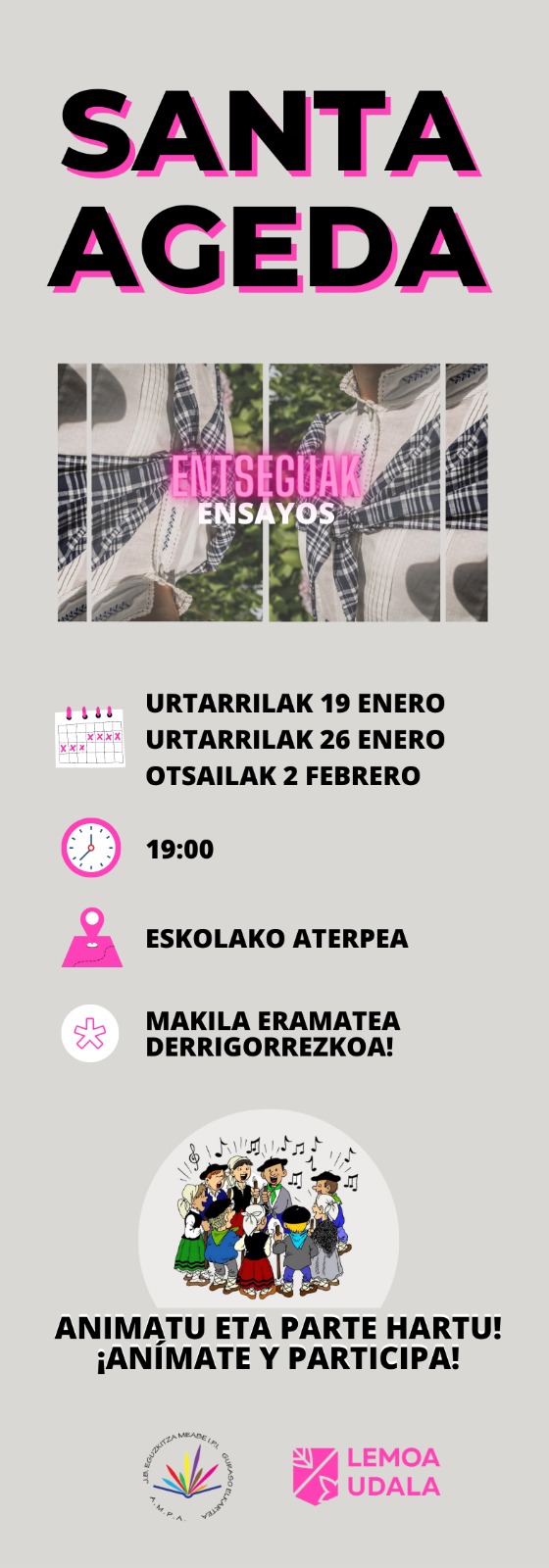 Santa Ageda eguna prestatzeko hiru entsegu egingo dira, pasa den astean egin zena eta beste bi. Falta diren bietara hurbildu nahi duenak oso erraz dauka: makila ekarri eta abesteko gogotsu etorri!