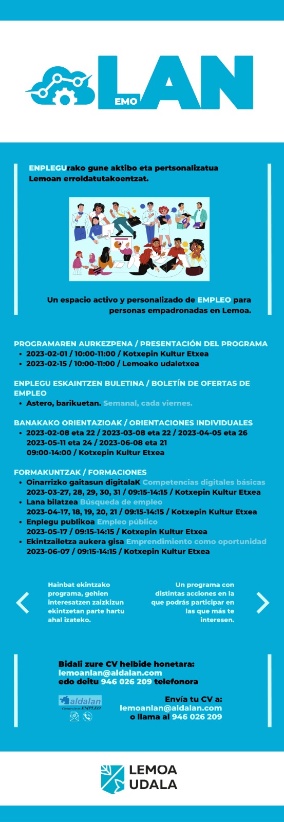 [cas] El Ayuntamiento de Lemoa ha publicado el calendario del programa de empleo Lemoan Lan. Un programa con distintas acciones en la que podrás participar en las que más te interesen.
