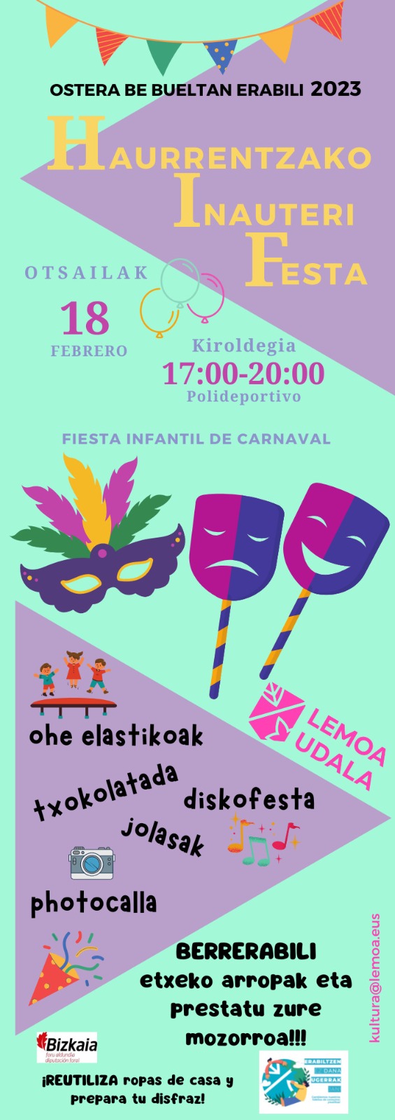 [eus] Urtero bezala, herriko txikientzat prestatutako Inauteri Festa ospatuko da, datorren otsailaren 18an. Aurten, gainera, Ostera be bueltan erabili programarekin bat eginez, mozorroa etxeko arropak berrerabiliz prestatzeko mezua luzatu zaie familiei.