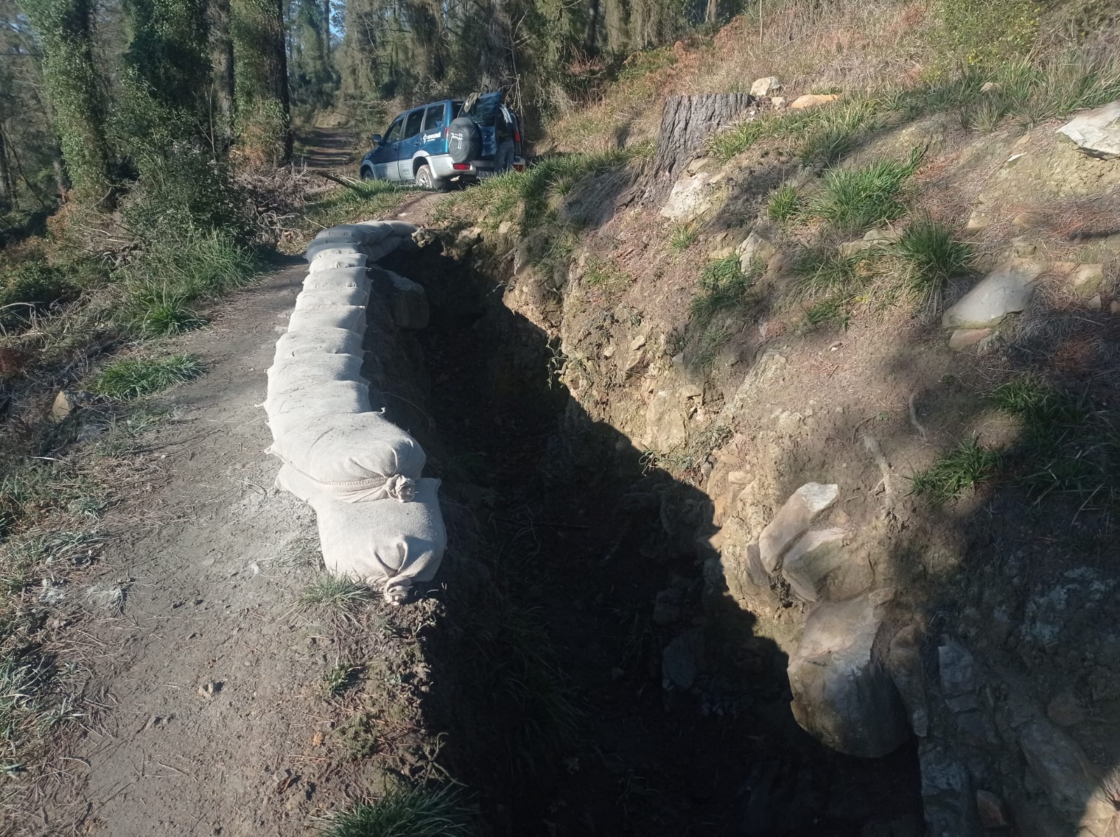 [cas] Mediante esta técnica se han colocado sacos de cemento con un envoltorio de tela especial, y la idea es que el material colocado se integre con el paso del tiempo en la línea de la trinchera.