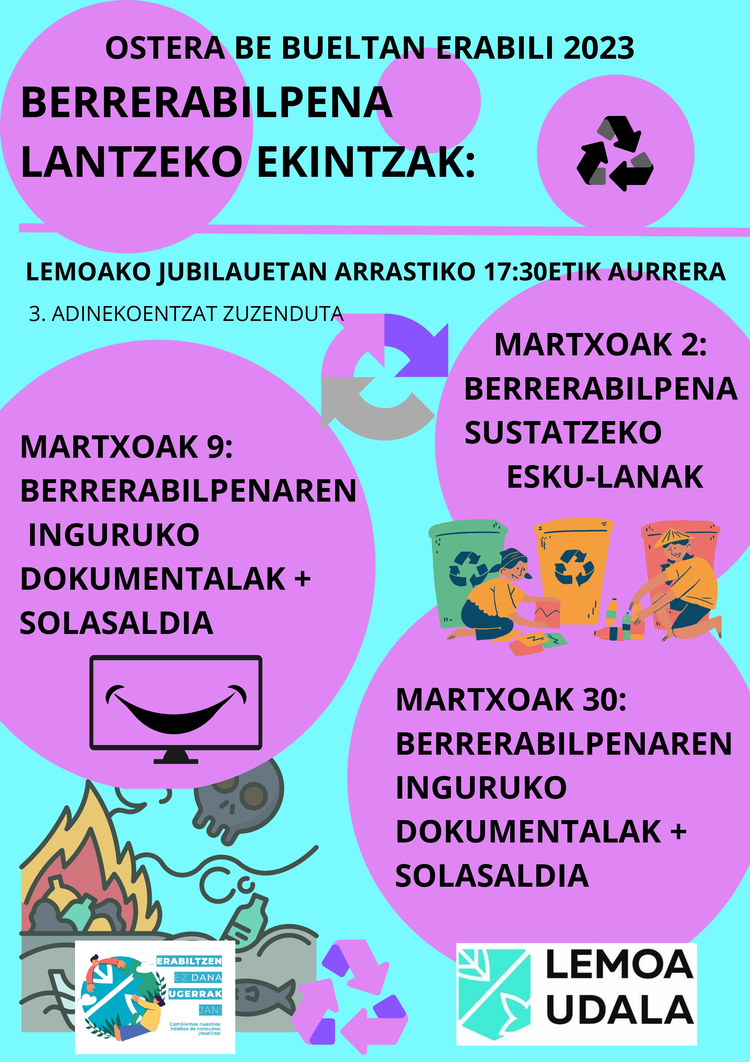 [eus] Ostera be bueltan erabili 2023 programaren barruan 3.adinekoei zuzendutako programazioa prestatu da hurrengo asteetarako. Alde batetik, berrerabilpena sustatzeko esku-lanak egingo dituzte, eta bestetik dokumentalak eta solasaldiak. [esp] Dentro del programa Ostera be bueltan erabili 2023 se ha preparado una programación para las próximas semanas, dirigida a la 3ª edad. Por un lado, se llevarán … Irakurtzen jarraitu Ostera be erabili 2023