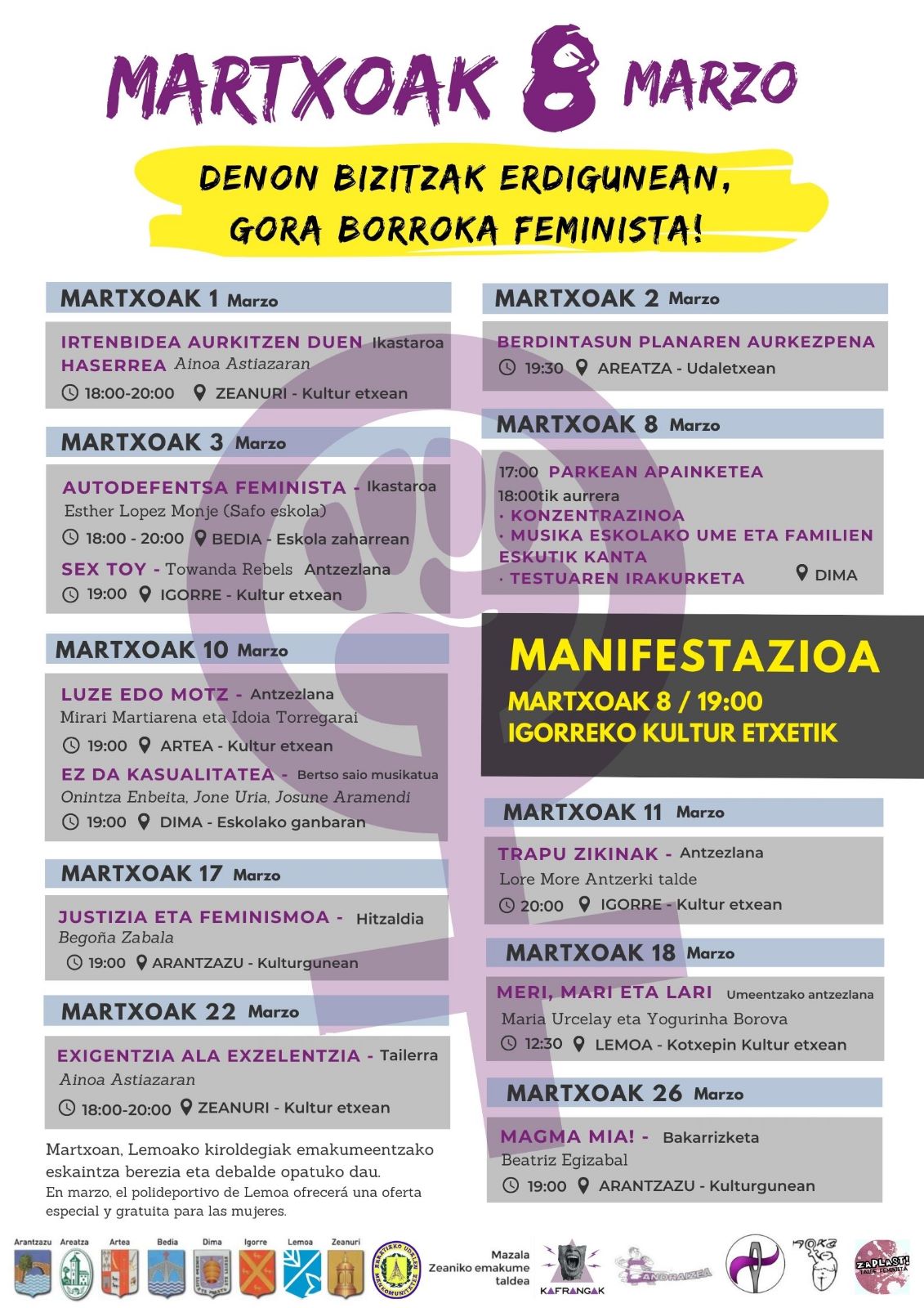 [cas] Como cada año, los ayuntamientos del valle de Arratia han preparado una intensa programación con motivo del Día Internacional de las Mujeres, bajo el lema “Denon bizitza erdian, gora borroka feminista”. La manifestación del 8 de marzo se celebrará en Igorre, y en lo referente a Lemoa se han preparado dos actividades, el 16 de marzo la obra de teatro “Mari, Meri eta Lari”, y la dinámica organizada desde el área de deportes.