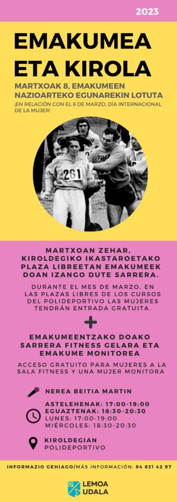 Martxoan zehar, kiroldegiko ikastaroetako plaza libreetan emakumeek doan izango dute sarrera. Bestetik, fitness gelara doako sarrera izango dute, eta emakume monitore baten laguntza jasoko dute.