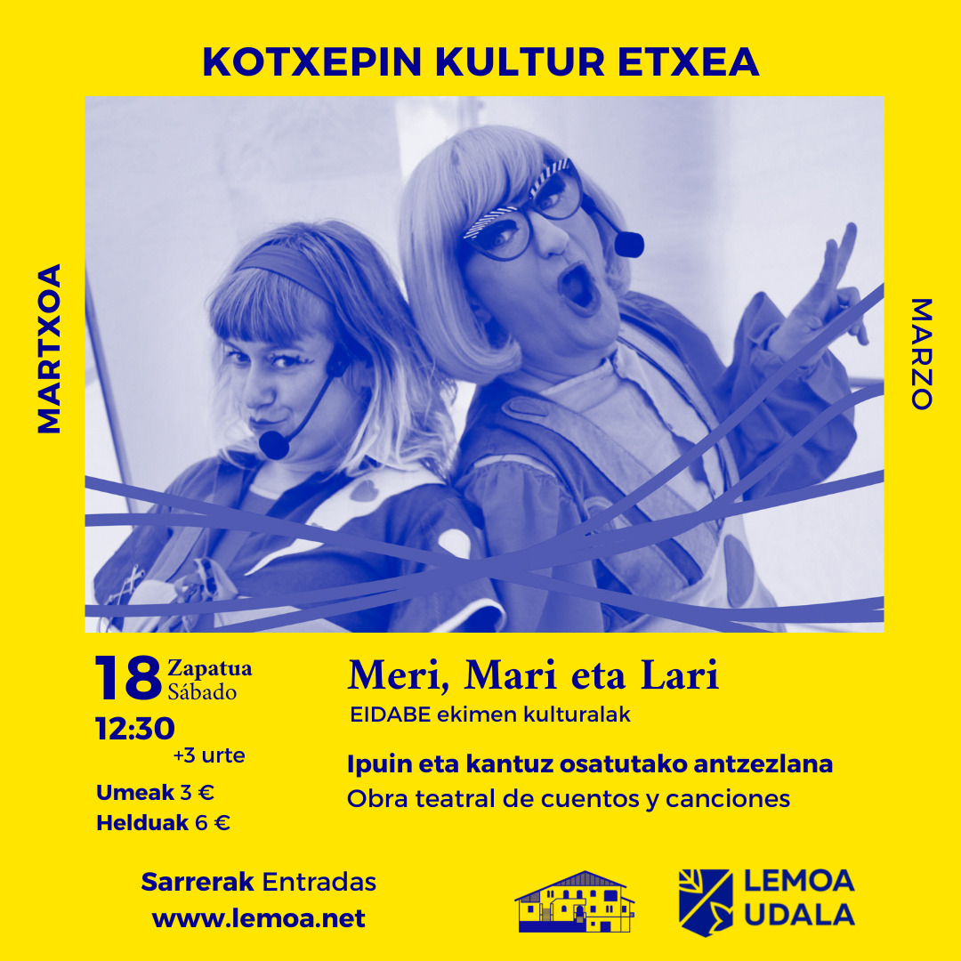 “Antzerkia komunikatzeko ahalmena duen tresna bat da, istorio dibertigarriak kontatzeaz gain, mamia duten gaiak lantzeko aukera ematen duena” [eus] Zer aurkituko du Kotxepinera zuen ikuskizuna ikustera hurbiltzen denak?Ikuskizun oso dibertigarria: ipuinez, abestiz eta aniztasunaren inguruko gaiez betea. Txikitxoentzat aproposa. Nondik dator “Meri, Mari eta Lari” ren ideia?Yogurinha Borovaren pertsonaiaren abesti bat izan zen abiapuntua: Sentipenak … Irakurtzen jarraitu Meri, Mari eta Lari!