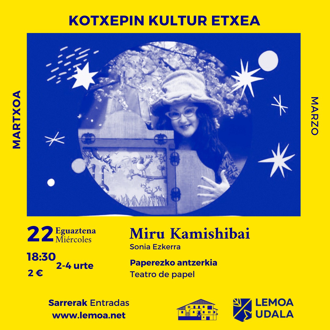 https://kultura.lemoa.net/sarrerak [eus] Paperezko antzerkia da Kamishibai. Japonian ahozkotasunean oinarritutako aintzinako tradizioa da. Ikusleen irudimena zabaldu, kontalariarekin elkarrekintza sustatu eta irakurketarako gogoa sortu du ikuskizun honek. [esp] Kamishibai es un teatro de papel, que se basa en una tradición ancestral japonesa basada en la oralidad. Es un espectáculo que amplía la imaginación del público, fomenta la … Irakurtzen jarraitu Miru Kamishibai