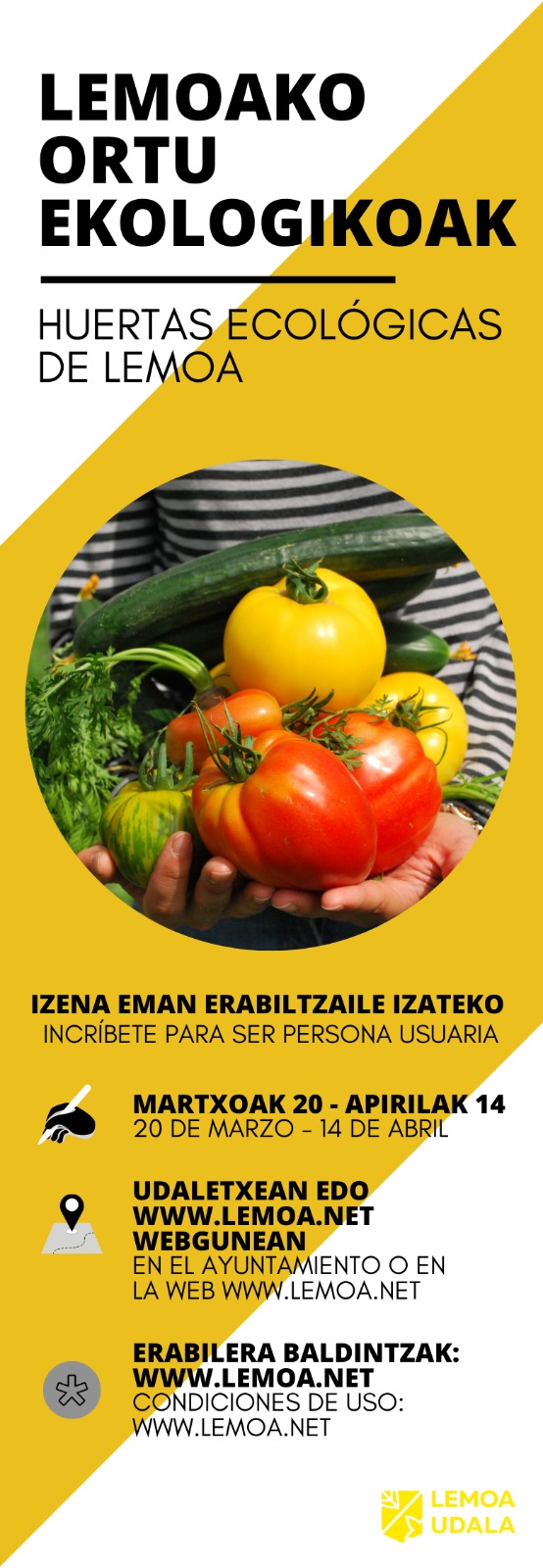 Izen-emate esteka: https://forms.gle/chfooXmEYASz8CTp9 Ordenantza: (EUS) https://www.lemoa.net/eu-ES/Udala/Ordenantzak-Araudiak/Udal%20ordenantzak/20230314-ordenanza-huertas-municipales-ocio-eus.pdf [eus] Lemoako Udalak ortu komunitarioak martxan jarriko ditu datozen hilabeteetan. Dagoeneko eskuragarri dago udalaren web orrian proiektuaren baldintzak zehazten dituen ordenantza, eta orain izena emateko aukera zabaldu da. Proiektuan parte hartu eta nekazaritza jasangarriko teknikei buruz ikasi nahi duten Lemoako bizilagunentzat erabilgarri egongo dira ortuak. Gainera, baratzarekin eta elikadura … Irakurtzen jarraitu Ortu ekologikoetan izena emateko epea zabalik –Abierto el plazo de inscripción de los huertos ecológicos