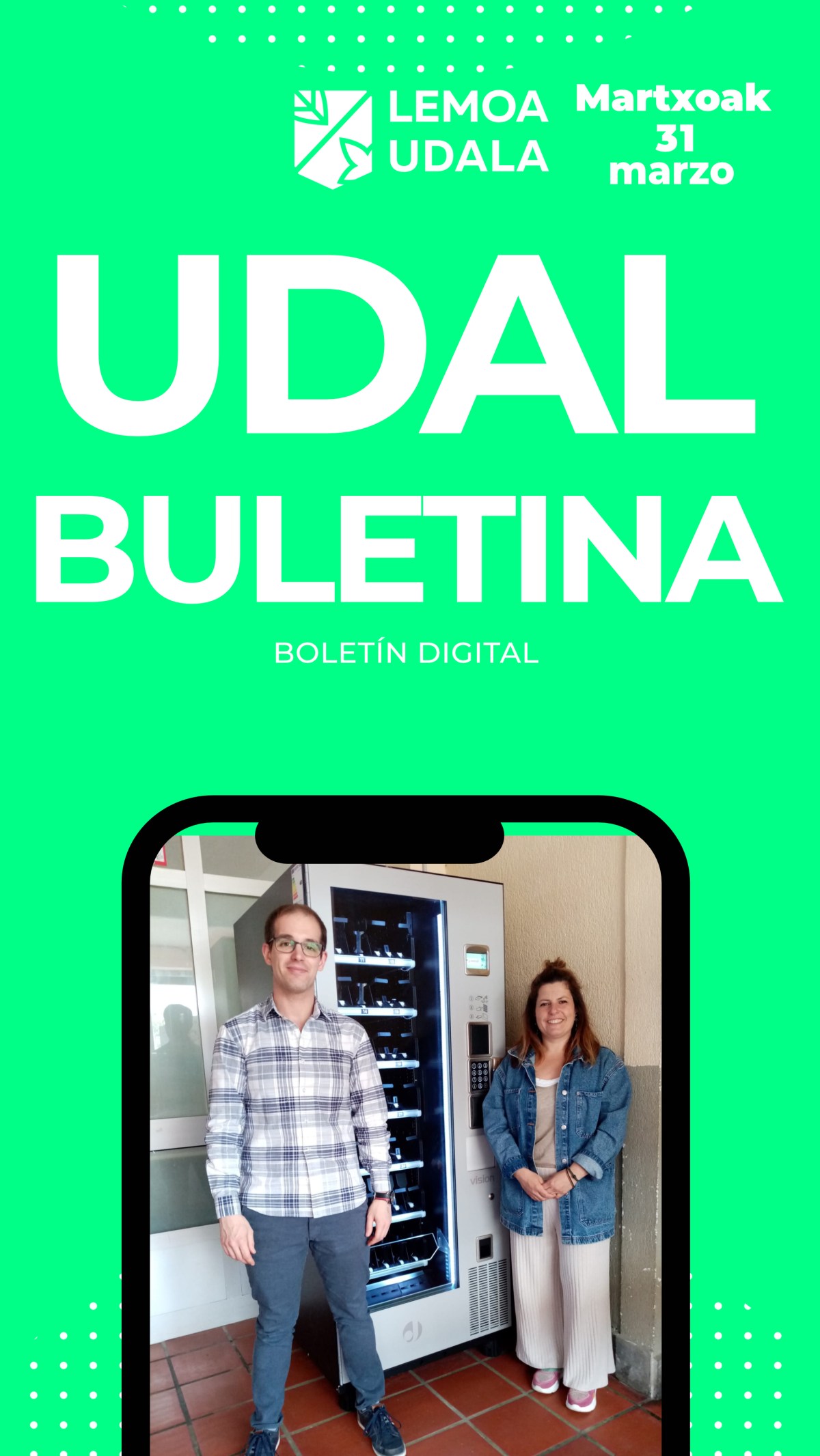 Atalak Udal buletina- Boletín digital Udal Buletina Martxoak 31 marzo Gehiago irakurri titularraren gainean klikatuz Leer más haciendo click sobre el titular Post author Garatzailea: lemoatzen Post date 2023-03-30 Boletín Municipal Lemoa Kustik Fest 2023 – Udaberriarekin batera, bueltan gara! – ¡Estamos de vuelta! UDALemoa 4 Hozkailu solidarioa – Nevera solidaria Kotxepin Kultur Etxea: hiruhileko programazioa – programación trimestral MICE Jagon Lemoa 2023 galdetegia – Cuestionario Jagon Lemoa 2023 Erronka 2023: Oraindik garaiz zabiltza azaroan edo abenduan izena emateko – Todavía estás a tiempo de apuntarte en noviembre o diciembre Ortu ekologikoetan izena emateko epea zabalik –Abierto el plazo de inscripción de los huertos ecológicos Lemoan Lan: asteroko lan postu eskaintzak – Ofertas semanales de empleo Comparte: Share on X (Opens in new window) X Share on Facebook (Opens in new window) Facebook Atsegin dut Kargatzen... Etiketak LemoaKustikFest2023 ← UDALemoa 4 → Ganzabal Mendi Taldeak 50 urte bete ditu!-¡Cumple 50 años!