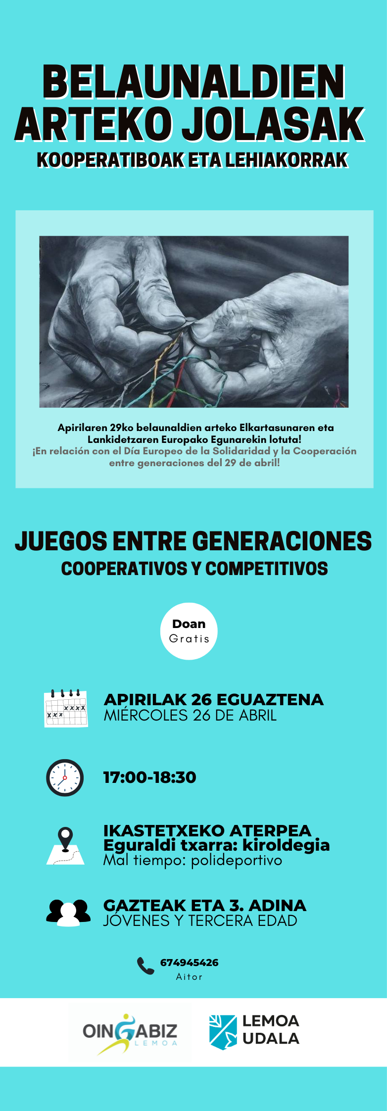 (Eus) Apirilaren 29a belaunaldien arteko Elkartasunaren eta Lankidetzaren Europako Eguna ospatzen da, eta hori dela eta, Lemoako eta hainbat elkarte, ekimen desberdinak antolatu dituzte. Apirilaren 26an, asteazkena, Oingabiz programaren baitan, Udalak belaunaldien arteko jolasak kooperatibo eta lehiakorrak antolatu ditu. Jolasak ikastetxeko aterpean izango dira (euria egitekotan kiroldegian), 17:00etatik 18:30ak arte eta udalerriko gazteei eta nagusiei … Irakurtzen jarraitu Belaunaldien arteko harremanak saretzen-Tejiendo redes intergeneracionales