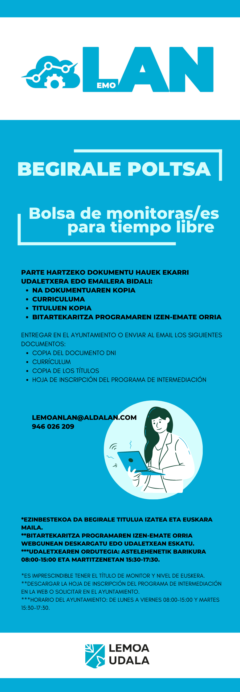 [eus] LEMOAKO UDALAK UDALEKUETAN LAN EGITEKO BEGIRALEEN POLTSA IREKI DU ETA IZENA EMAN DAITEKE JADA. Udalekuetan lan egiteko begiraleen poltsan izena emateko epea zabalik dago eta interesdunek programan parte hartzeko beharrezkoak diren dokumentuak udaletxera bidali beharko dituzte. Aurkeztu beharreko dokumentazioa honakoa da: NAN dokumentuaren kopia, curriculuma, begirale tituluaren kopia eta izen-ematearen orria (hemen deskargatu daiteke: … Irakurtzen jarraitu Udalekuetarako begirale bila gabiltza!-¡Buscamos monitoras/es de tiempo libre para las colonias de verano!