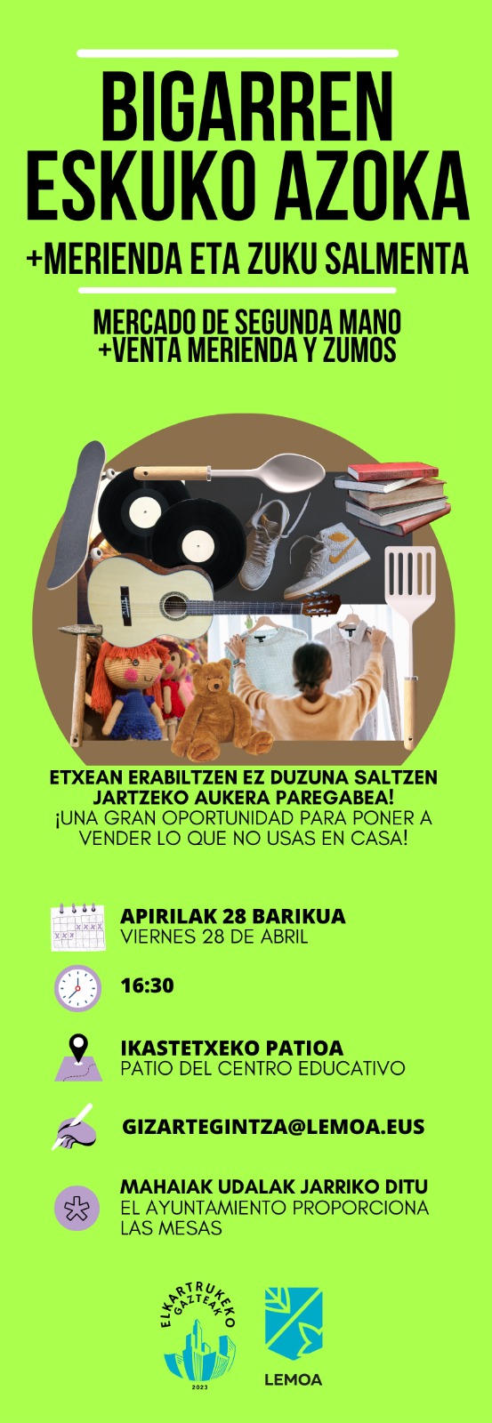 Bidaiaren gastuak udalak eta familiek hartuko dute bere gain, baina gazteek ere haien aletxoa jarri gura dute, eta, horretarako, apirilaren 28an bigarren eskuko azoka antolatu dute, 16:30ean ikastetxeko patioan.