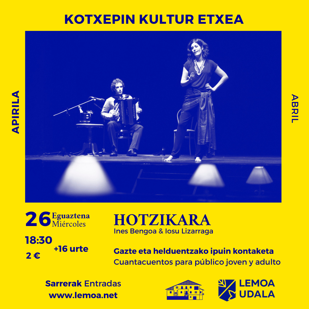 [Eus] “Hotzikara” hasieratik hasten den ikuskizuna da: munduaren hastapenetatik, alegia. Eta hortik abiatuta, erotismoa historian zehar nola gertatu den kontatzen du. Garai guztietako emakume eta gizonek sexu-atsegina sentitu dute jakin-nahi, beldur eta askatasun maila desberdinetan. Iosu Lizarragaren musikak eta Ines Bengoaren ahotsak egoera ezberdinak proposatu, pertsonaia ugari aurkeztu eta ikus-entzuleei istorioen bitartez bidaia batean sar … Irakurtzen jarraitu “Hotzikara”: Gazte eta helduentzako ipuin kontaketa- Narración oral para público joven y adulto