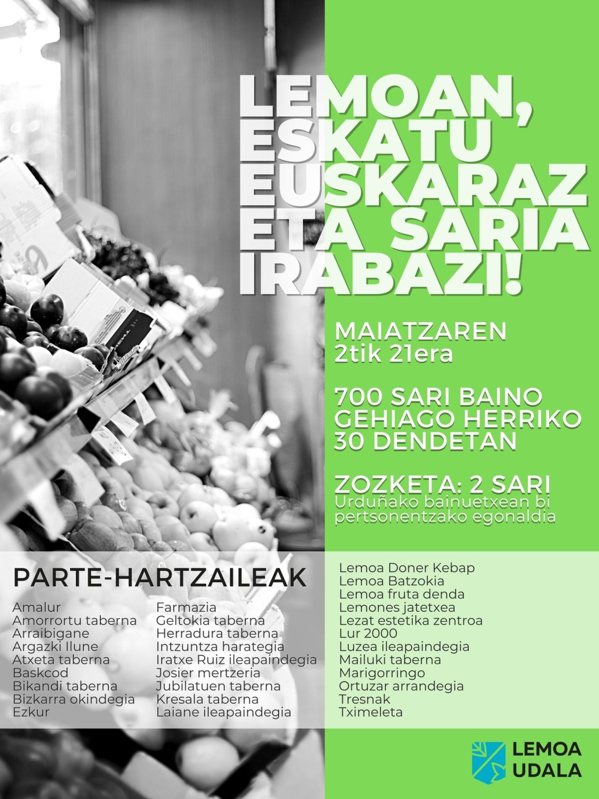 ‘LEMOAN, ESKATU EUSKARAZ ETA SARIA IRABAZI!’. HALA DIO MARTITZENEAN ABIATUKO DEN MERKATARITZA KANPAINAREN LELOAK. MAIATZAREN 2TIK 21ERA ARTEAN EGINGO DA KANPAINA LEMOAKO 30 DENDA ETA TABERNETAN, ETA DENETARA 700 SARI BAINO GEHIAGO BANATUKO DIRA.