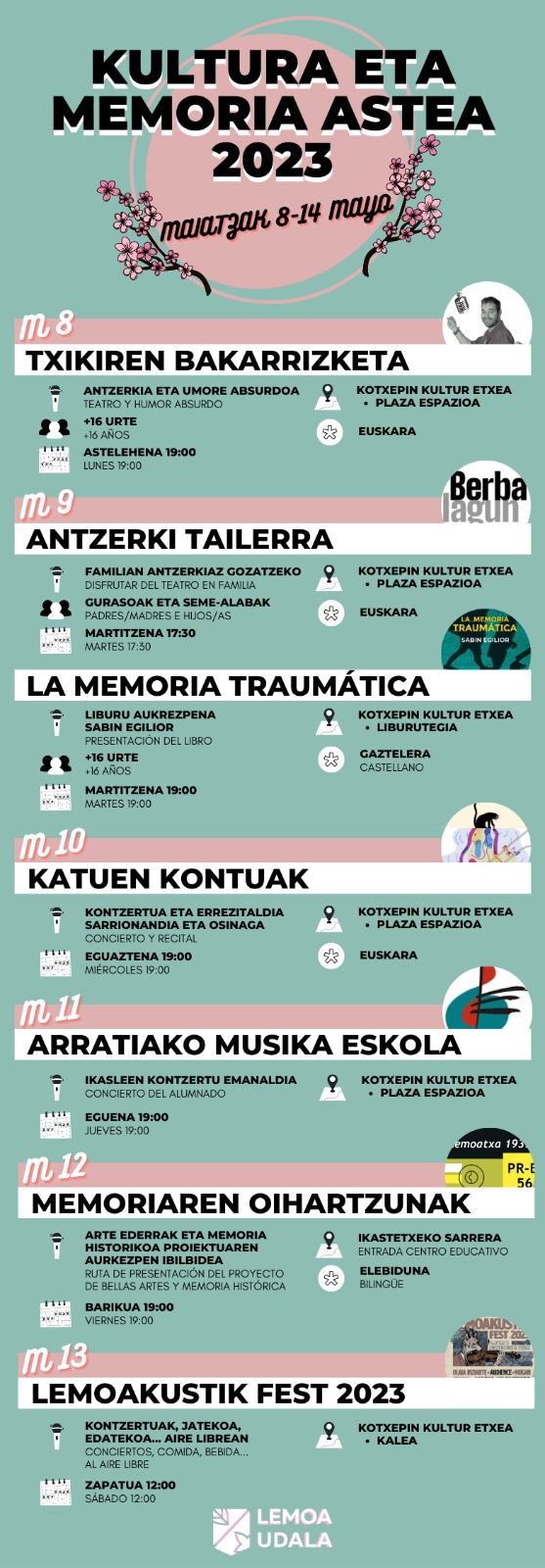 [Eus] Urtero bezala, aurtengo Kultura eta Memoria astea ekimenez beteta dator. Eskaintza honen bitartez, udalak herritarrei kultura eskaintza berezia eskaini eta memoria historikoari lotutako espazioak zabaldu nahi ditu. Udalak prestatutako egitaraua honako hau da, eta maiatzaren 9tik 15era luzatuko da: Astean zehar ere, eskolako gurasoak, hainbat ekimen antolatu dituzte umeentzako eskola orduetan. [Cas] Como todos … Irakurtzen jarraitu Kultura eta Memoria astea 2023-Semana de la Cultura y la Memoria 2023