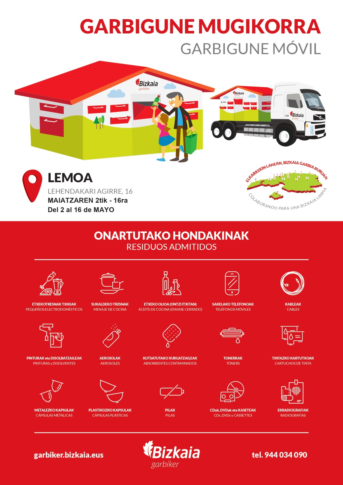 Aurten ere, etxeetan sortutako hondakin jakin batzuk behar bezala kudeatzeko aukera eskainiko die Lemoako Udalak herritarrei, Garbigune mugikorra erabiliz.