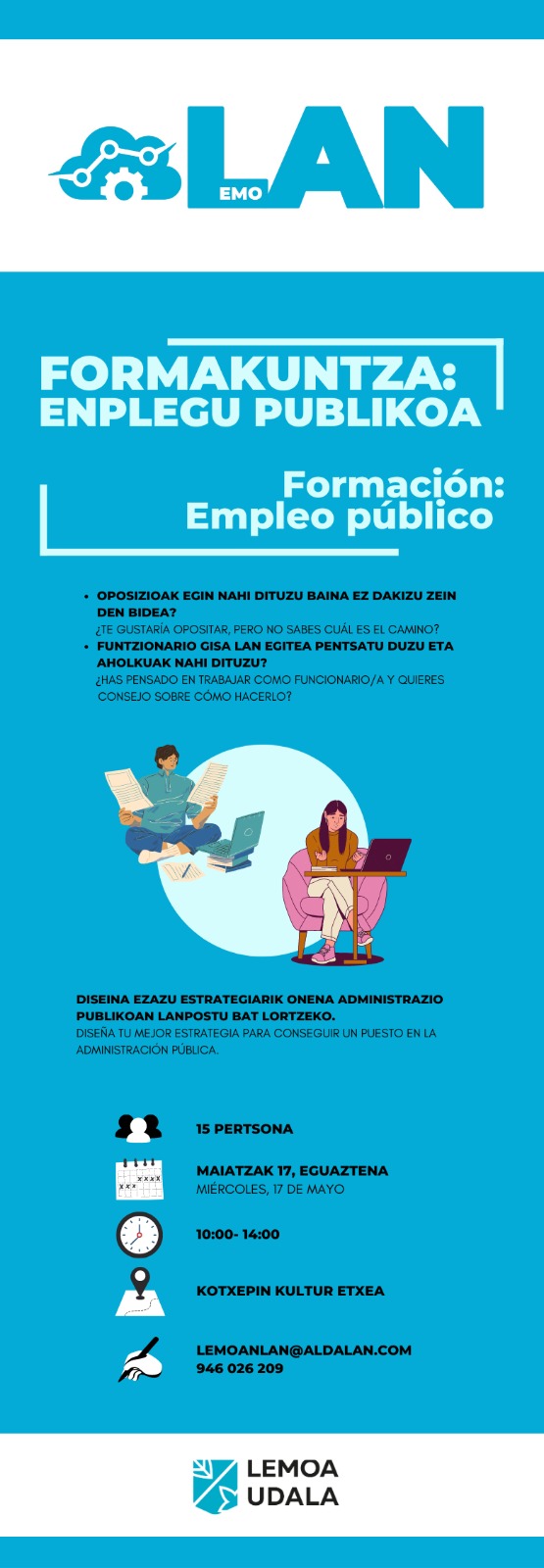 [Eus] Oposizioak egin nahi dituzu baina ez dakizu zein den bidea? Funtzionario gisa lan egitea pentsatu duzu eta aholkuak nahi dituzu? Lemoako Udalak formakuntza saio berri bat antolatu du maiatzaren 17rako (10:00-14:00) eta saioaren helburua izango da administrazio publikoan lanpostu bat lortzeko estrategian diseinatzen ikastea. Formakuntzan izena emateko idatzi lemoanlan@aldalan.com helbidera edo deitu 946.026.209 telefono … Irakurtzen jarraitu Administazio publikoan lanpostua lortzeko formakuntza-Formación para conseguir un puesto en la administración pública