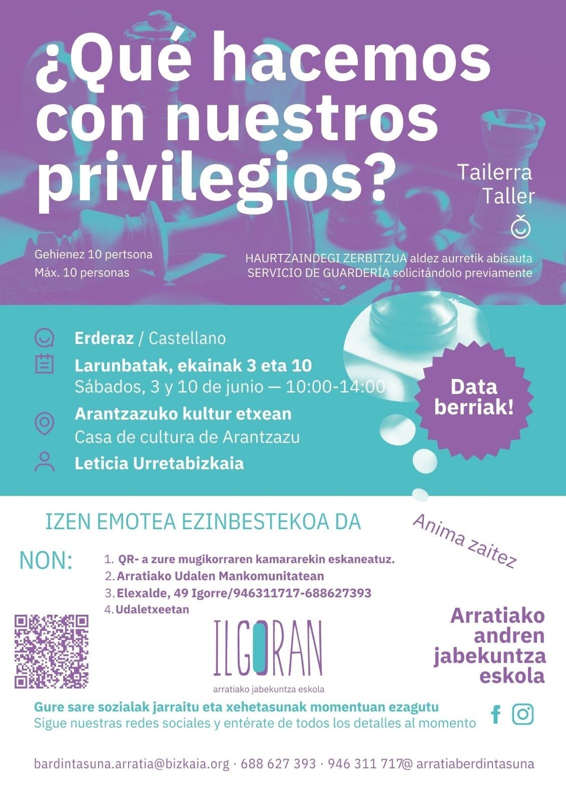 [eus] Pribilegioek harreman estu-estua dute geure boterea erabiltzeko moduarekin, eta pertsona askorentzako ezarritako boterea erabiltzeko modua oso urrun dago geure balioetatik eta eraiki nahi dugun mundutik; beraz, gai honek aurkako sentimenduak sor ditzake guregan. Geure pribilegioen gainean zenbat eta kontzientzia handiagoa izan, orduan eta aukera gehiago izango dugu horiek geure balioekin koherentzian erabiltzeko, ezagutzen dugun botere forma erreproduzitu beharrean. Horregatik, tailer honetan hausnarketa egin nahi dugu ditugun pribilegioez, haiekin nola sentitzen garen eta nola erabiltzen ditugun. Tailerra egin aurretik gogoetarako pista bat da pentsatzea nola sentitzen garen geure pribilegioez hitz egiten digutenean: interesa pizten digu, estimulatu egiten gaitu, jakin-mina pizten digu? Edo ezinegona sortzen digu, deserosotasuna edo haserrea? Gai honetan sakontzeko, etor zaitez esperimentatzeko, malgua izateko eta umorea erabiltzeko gogoz. Geure baitan dauden egitura hierarkiko horiekin jolas egin dezagun.