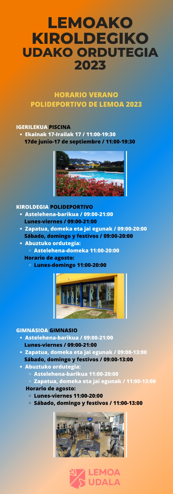 Lemoako Kiroldegiko Udako Ordutegia – Horario de verano del Polideportivo de Lemoa
